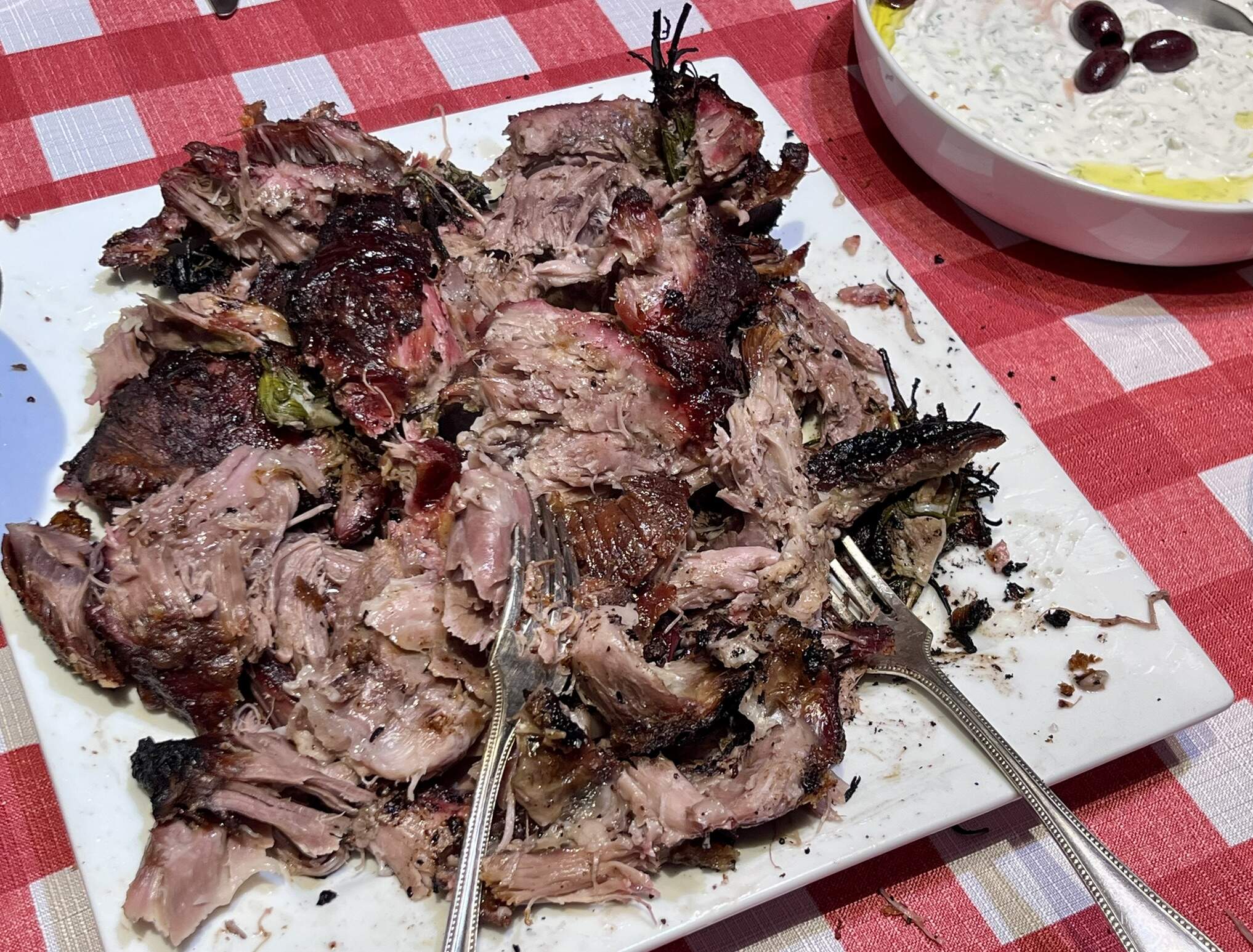 The grilled shoulder was pull-apart tender & absolutely delicious, thanks to the lovely advice I got from a few HOs on this thread. I was reminded of my first ever whole lamb grilled on a beach in Santorini in the early 80s. So flavorful, with crispy fatty bits & a wonderful char!