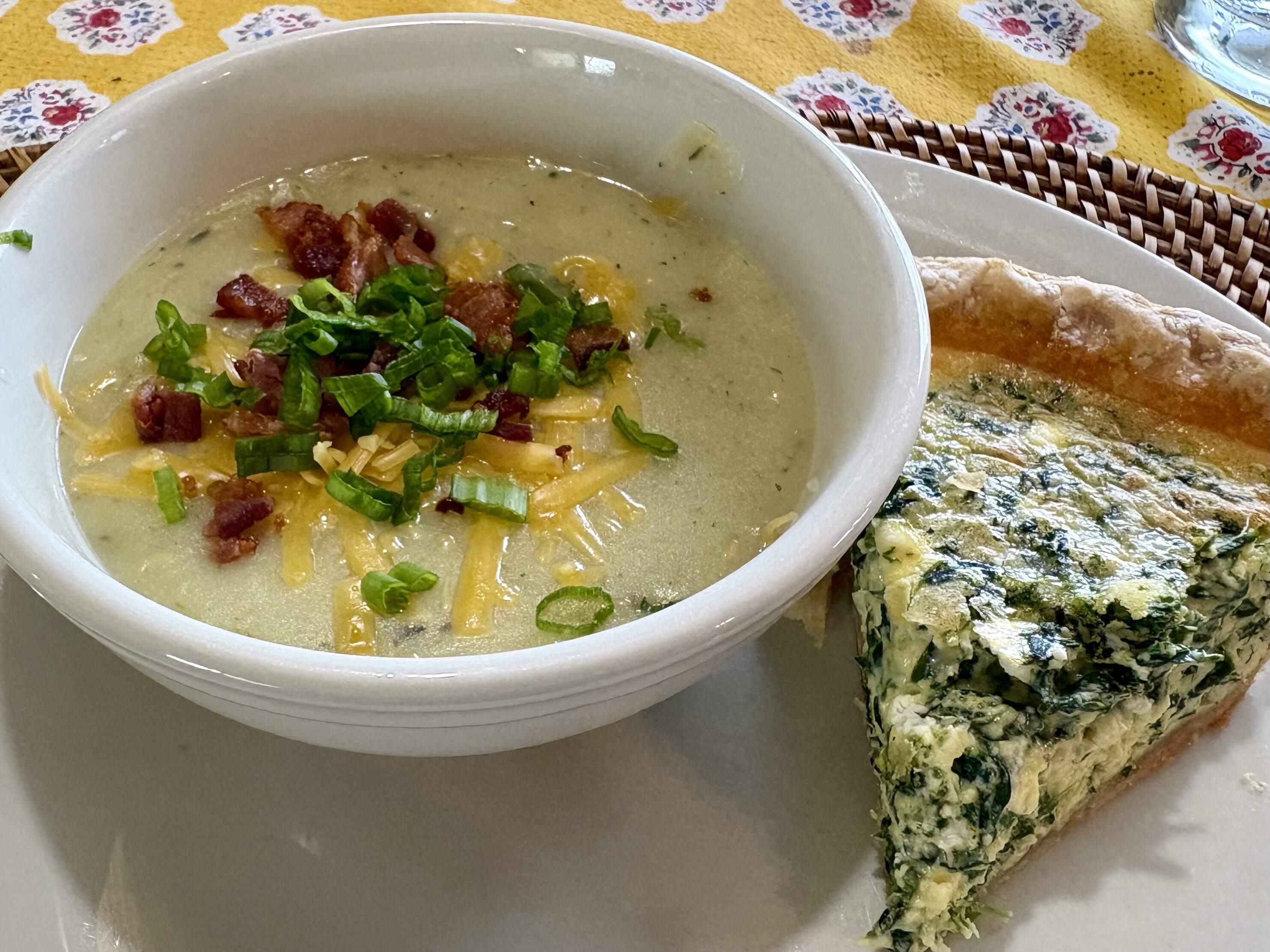 Spinach and gruyere quiche. Potato soup with cheddar, bacon bits, and scallions.