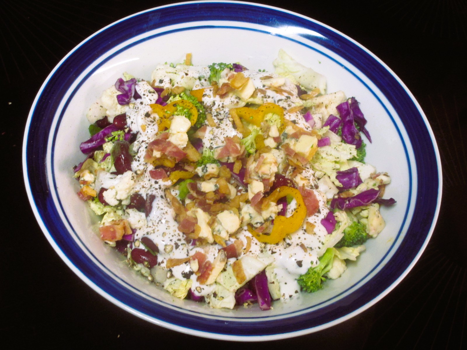 Large chopped salad. Red and savoy cabbages, green onion, broccoli, cauliflower, sweet s’nap orange pepper, kidney beans, ranch dressing, a mélange of cambozola, bacon and crispy onions.