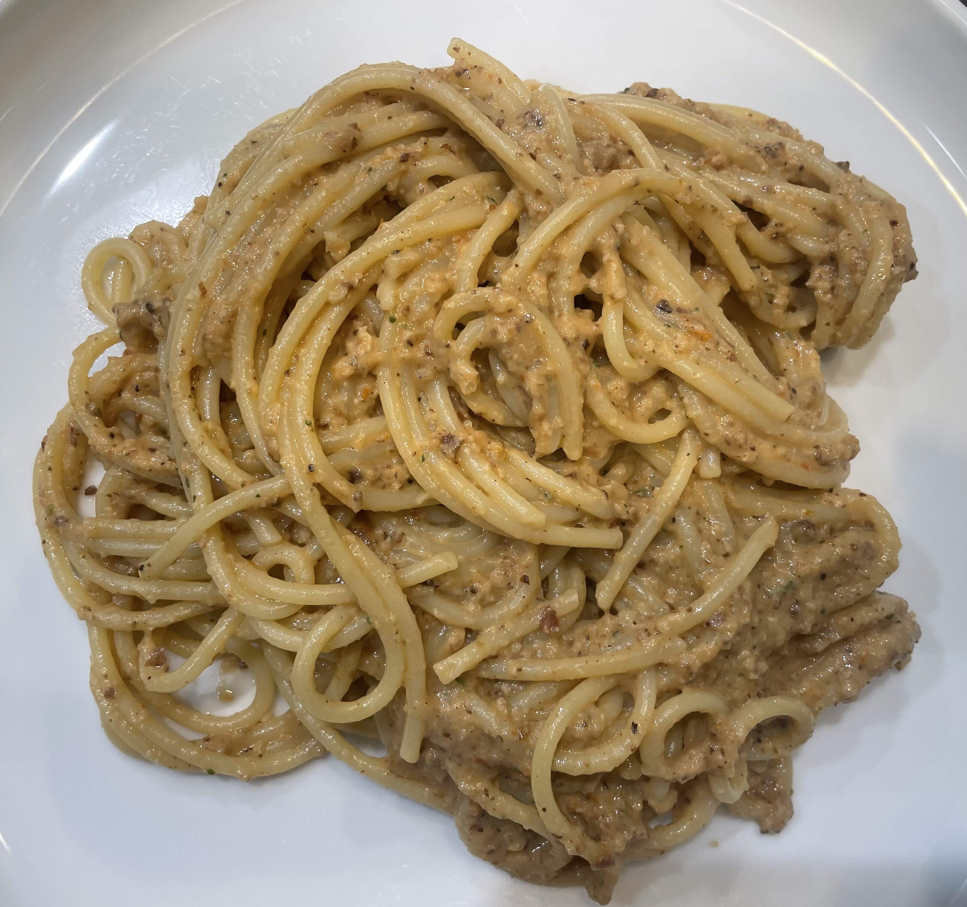 Spaghetti with Porcini Pesto - dried porcini and dried tomatoes are soaked in hot vegetable broth before pureed with garlic, olive oil roasted almonds, parmesan, olive oil and lemon thyme. Served with spaghetti