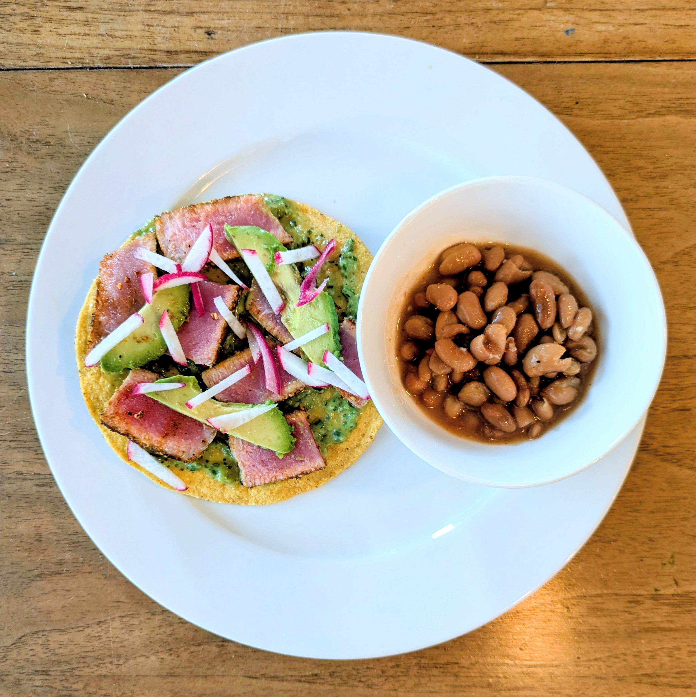 Tonight I made chili-seared tuna tostadas with a homemade avocado-lime salsa, radish, avocado slices, and pickled red onion with a side of pinto beans and a green salad (not pictured) with leftover chipotle-honey vinaigrette from…Chipotle. Not bad for quick!