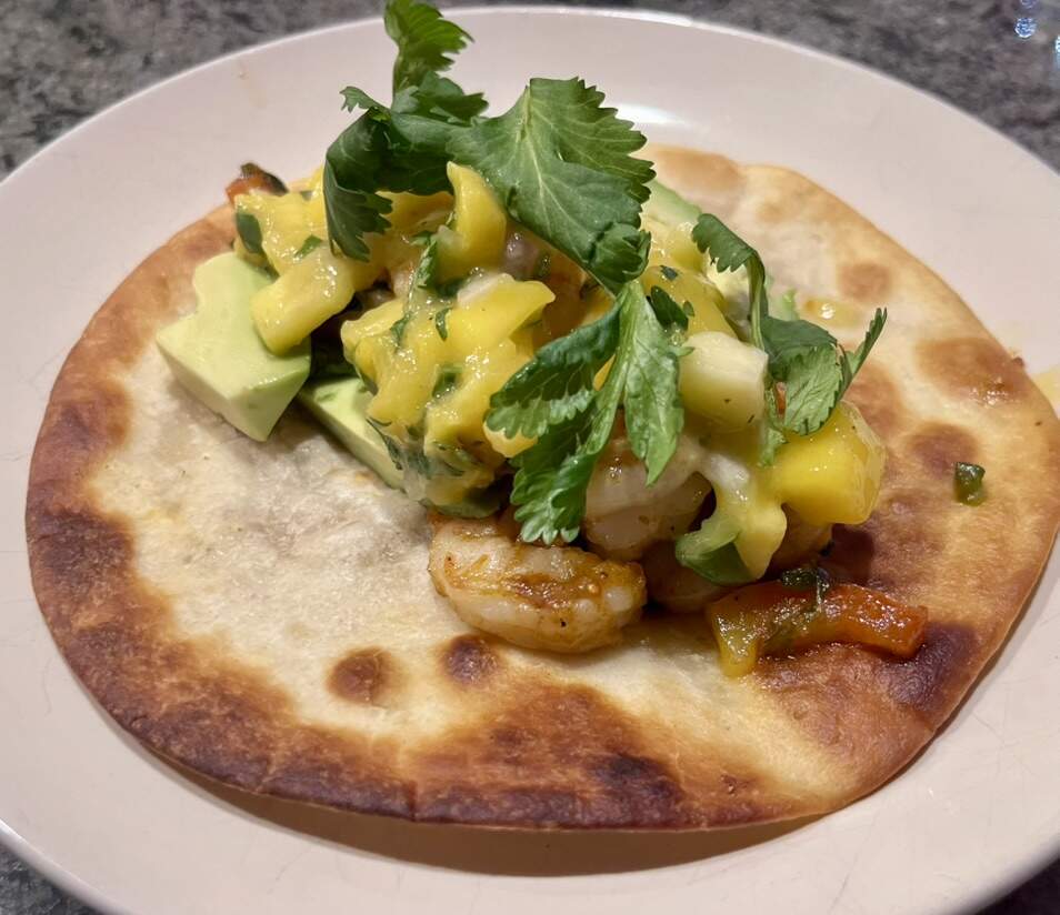 The salsa turned out to be too sweet & overpowering the shrimp, so we left it off our second tacos. Might be better as a relish / side salsa for grilled swordfish or mahi mahi, TBH.