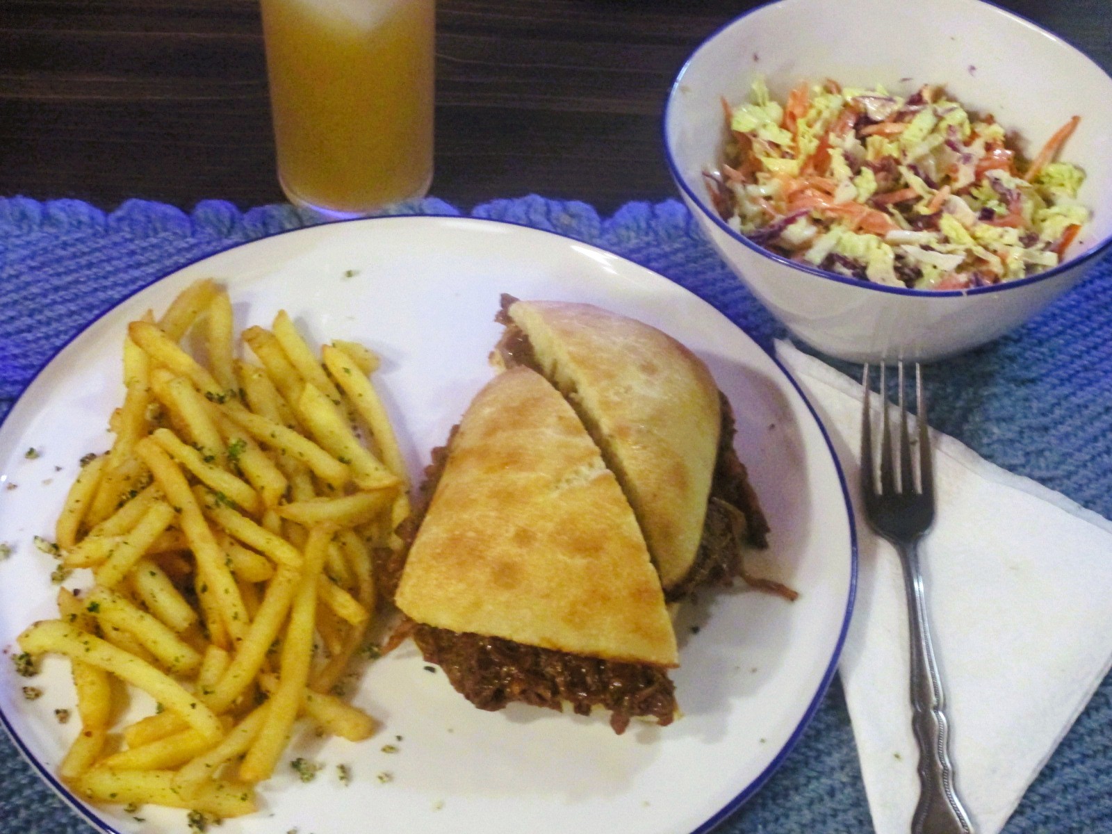 BBQ pork country ribs from the freezer and onions on a buttered and toasted ciabatta roll; extra crispy ff garlic fries; cabbage slaw with a curry dressing. Hard cider.