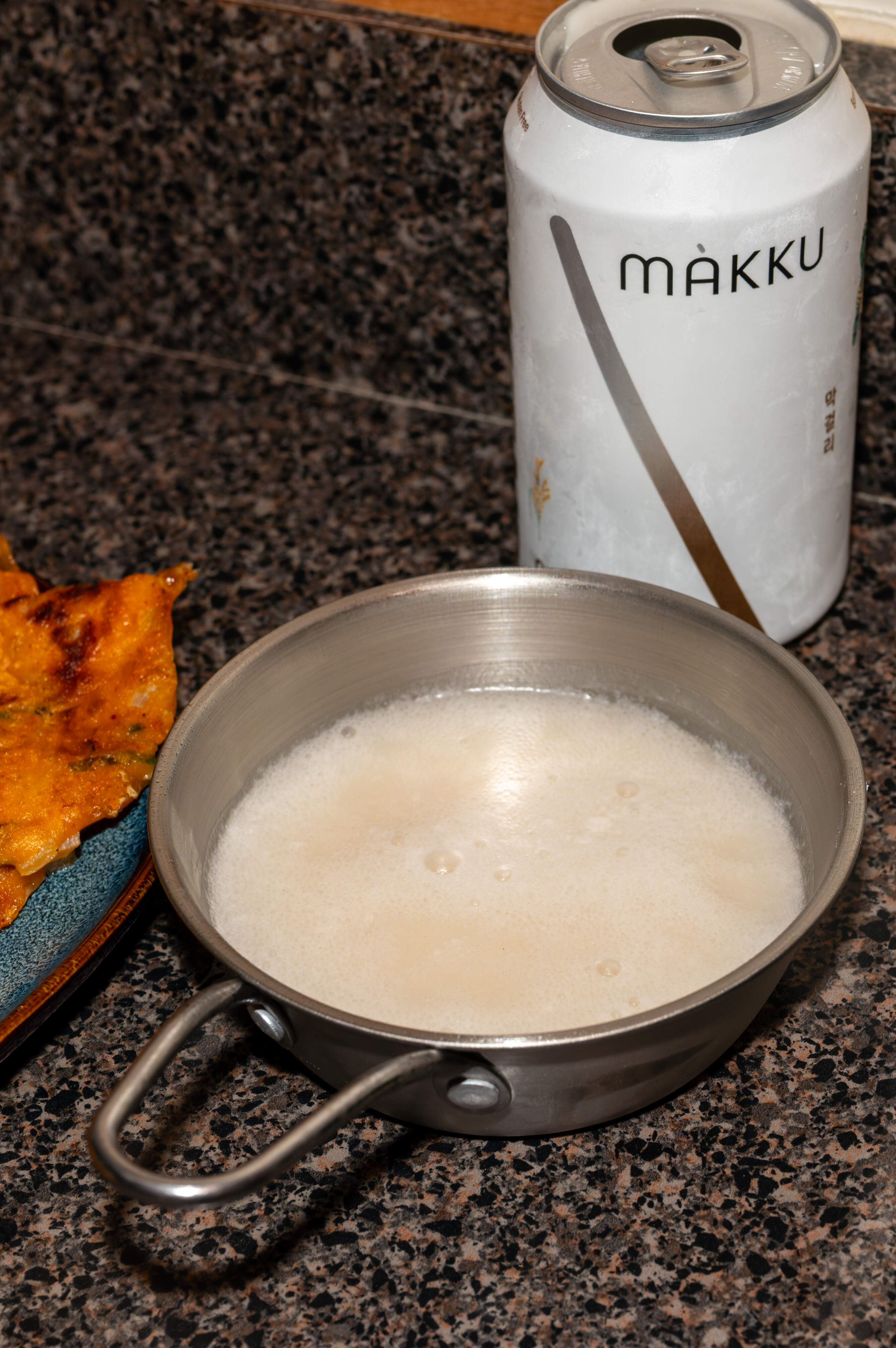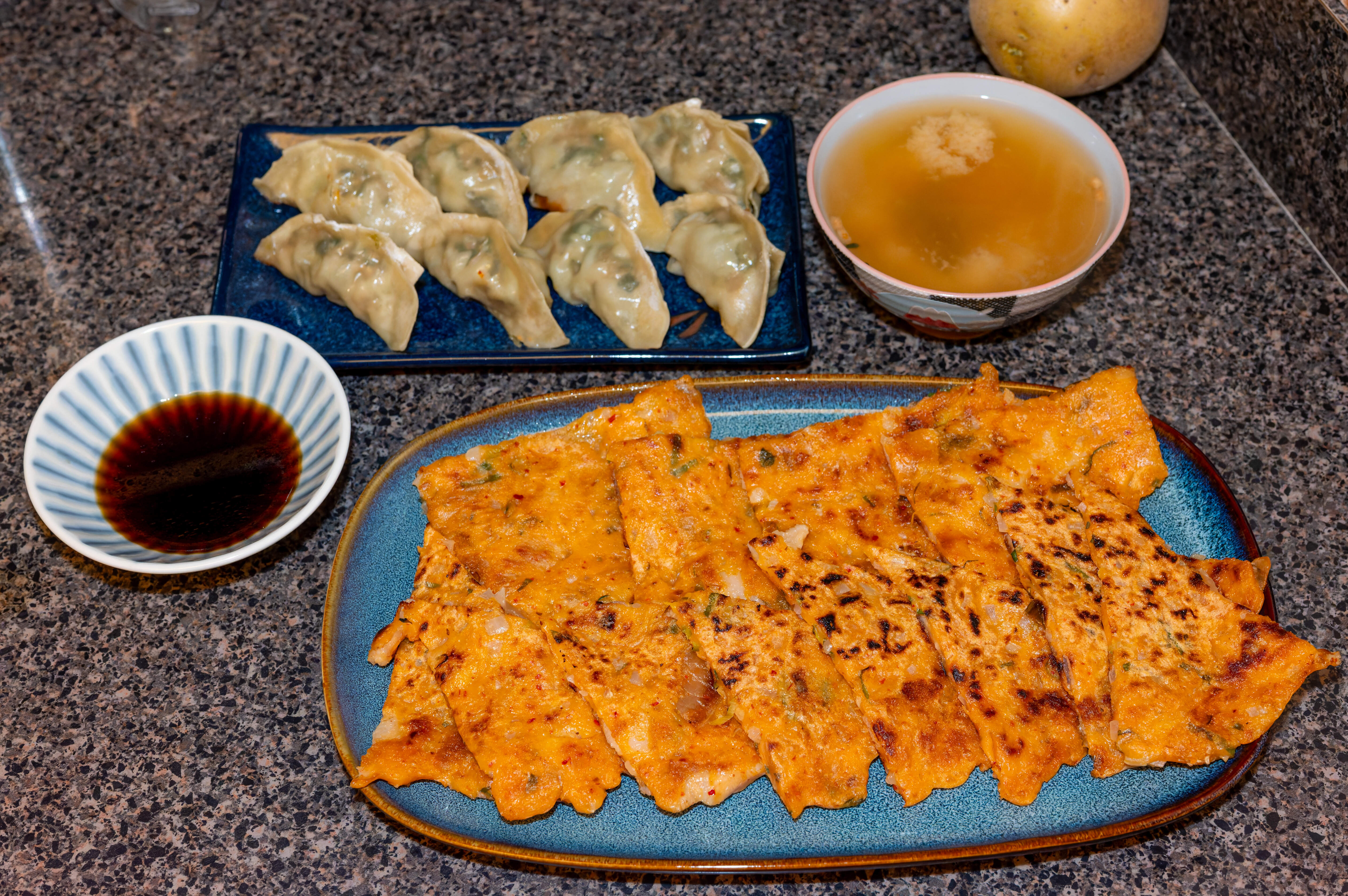 I mixed half a cup of Korean pancake mix, half a cup of cold water, half a cup of chopped kimchi, one chopped scallion, thinly sliced pork belly, and a little minced onion, and then fried up two medium sized pancakes. I also had some gyoza from the freezer and a can of makgeolli.