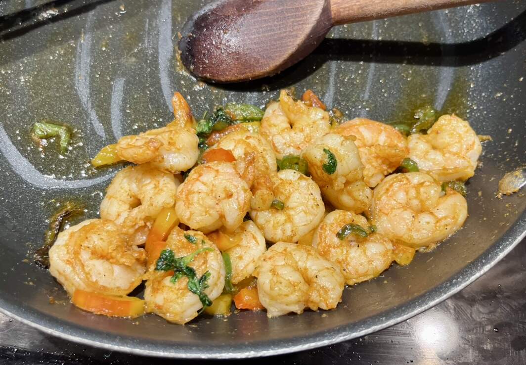 I fried up half a sliced graffiti pepper & 3.5 hot jalapeños and added them to the shrimp I’d seasoned with cumin, tajin, s&p before tossing in a hot pan shimmering with avocado oil.