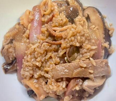 I realize this looks not so great, but it was actually quite satisfying. I had leftover rice, French breakfast radishes and shiitakes (also a quantity of star anise procured for free from a restaurant liquidation), so I made sort of this. The rice subbed for the starch slurry, and I added squid because I thought some squid would be nice. Came out good! Would make again!