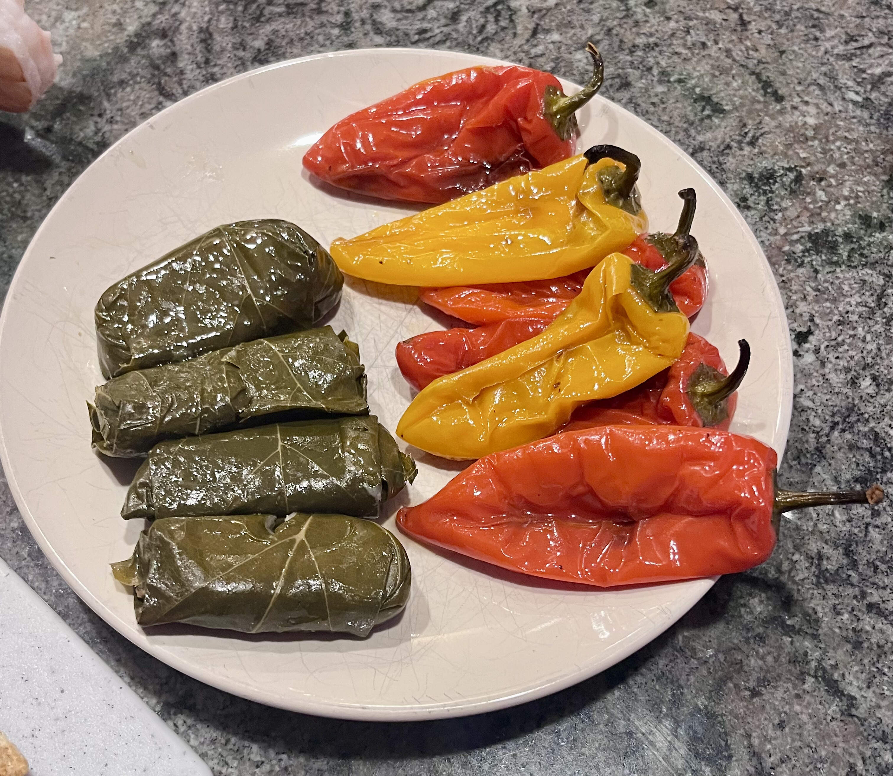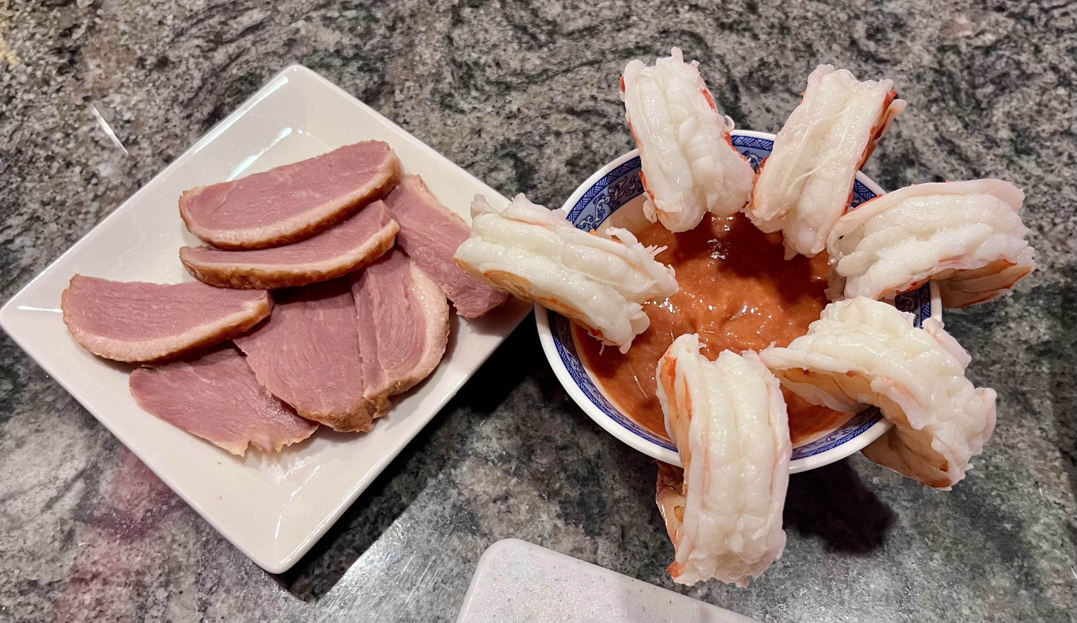 Instead, a veritable smorgasbord of Kleinigkeiten aka little things / tapas Abendbrot kinda meal: smoked duck breast, Boursin, our friend’s delectable seeded sourdough, shrimp cocktail, dolma, roasted sweet peppers.