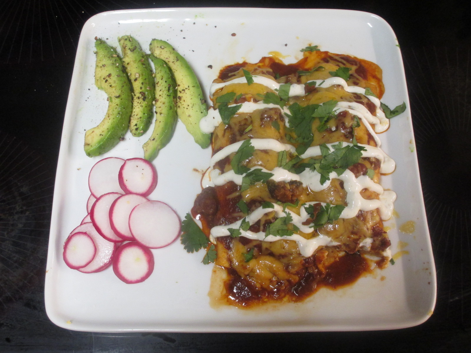 Chorizo and bean enchiladas from the freezer. Avocado and radishes. Faux margarita. I’m stuffed too.