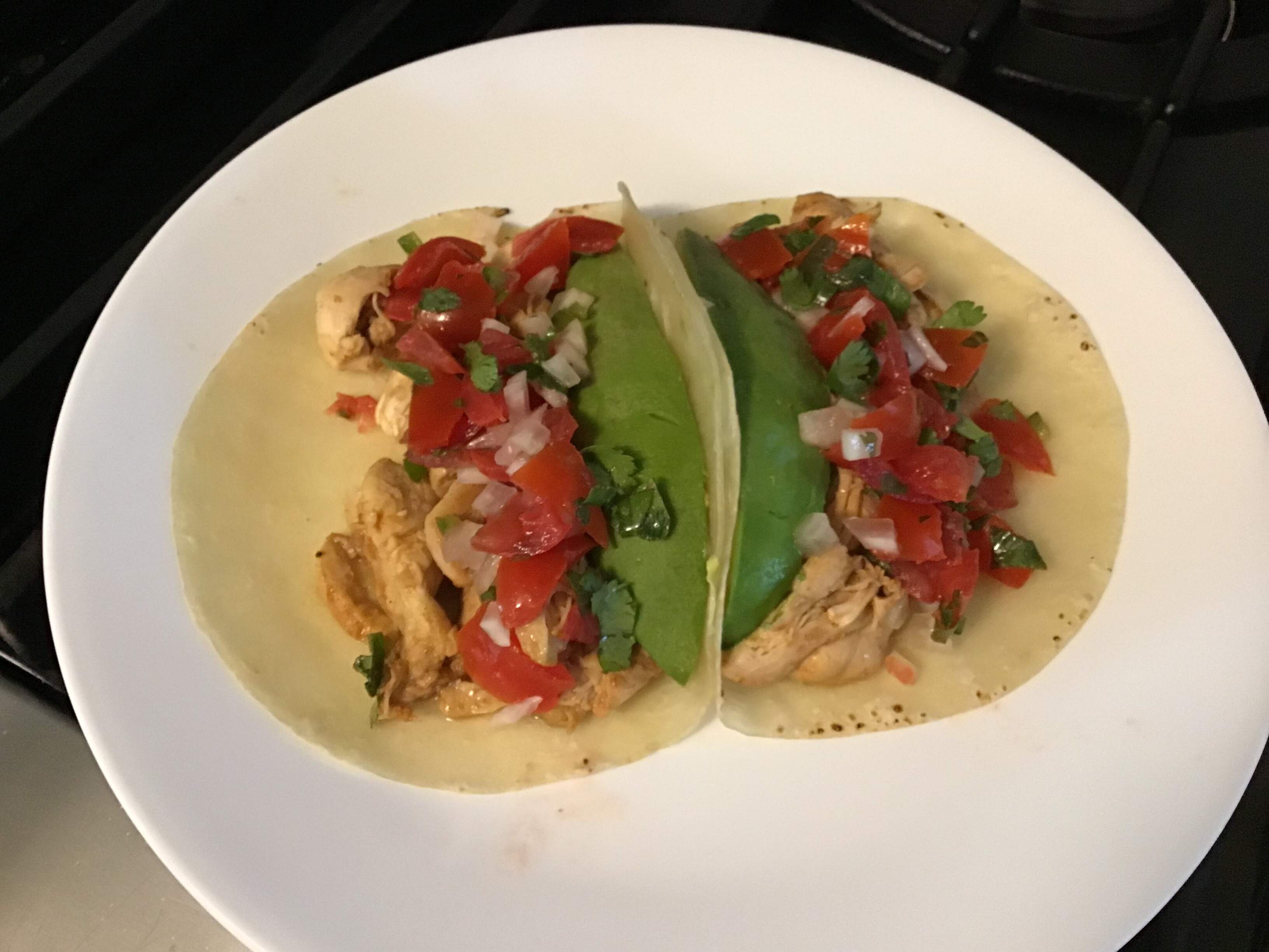 Taco Tuesday. NYT Easy Chicken Tacos (which will not be a repeat for me; easy but one-dimensional flavor) on fancy flour-lard tortillas (which will also not be a repeat for me) with delicious pico de gallo and fancy avocado shipped to me by my sister.