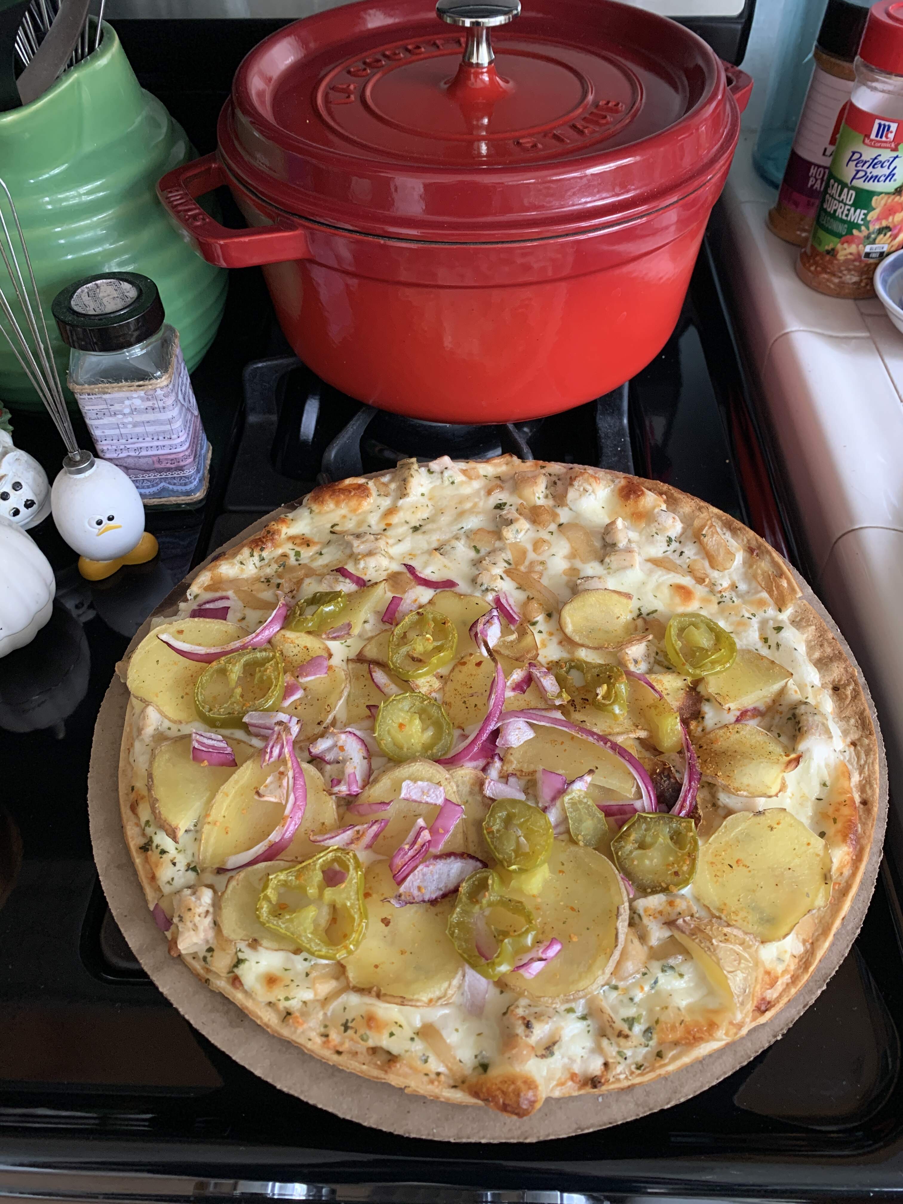 Thin crust chicken Alfredo pizza with added potatoes, red onion, jalapeno., and hot honey. Ate a slice and it wasn’t done to my liking so the other two pieces are with additional minutes in the air fryer.