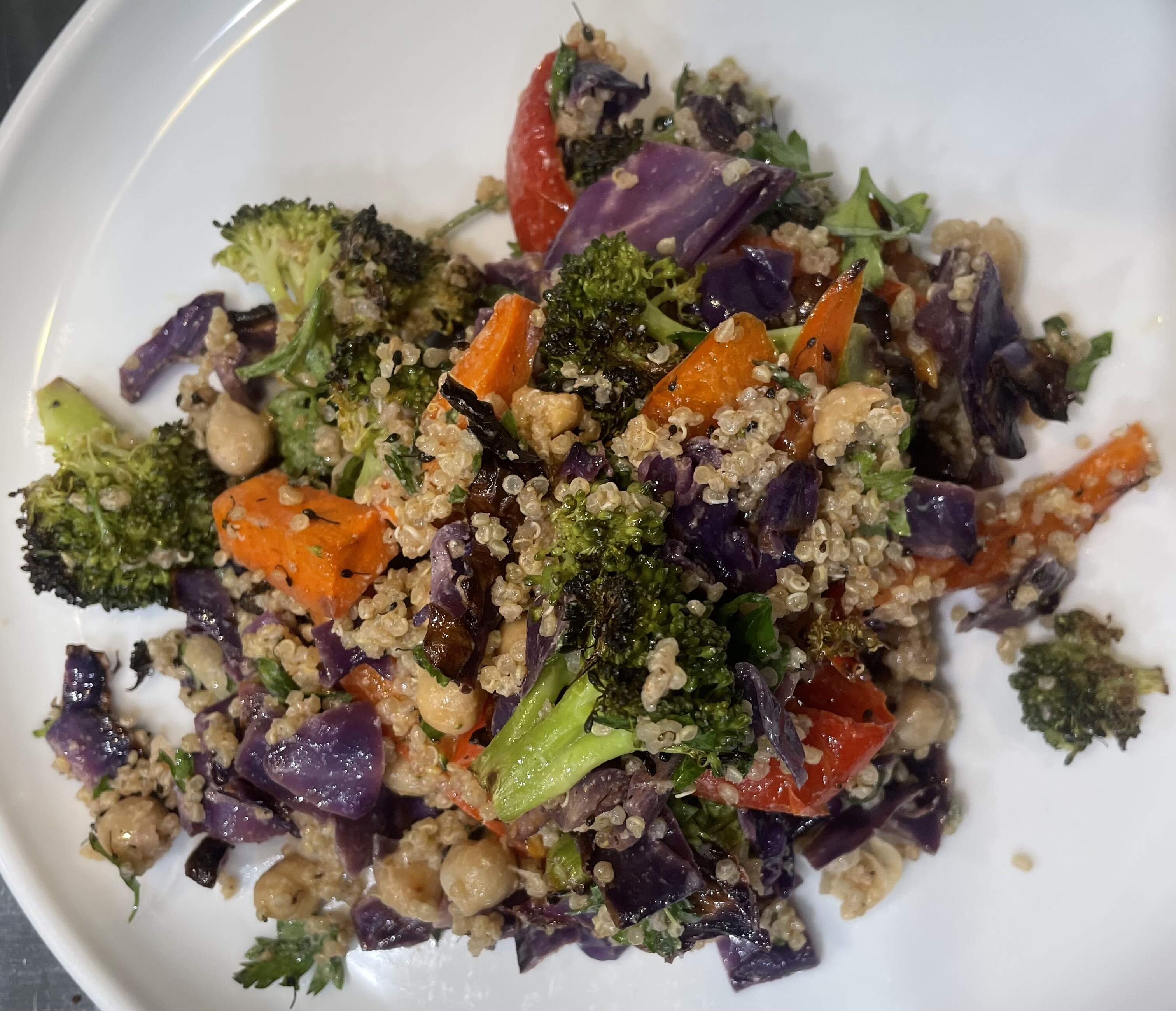 Oven-“Salad” - red cabbage, red bell peppers, broccoli and carrots are roasted with paprika and oil in the oven and cooled down. Cooked and cooled quinoa is mixed with the roasted vegetables, chickpeas, parsley and a vinaigrette made from tahini, honey and lemon juice.