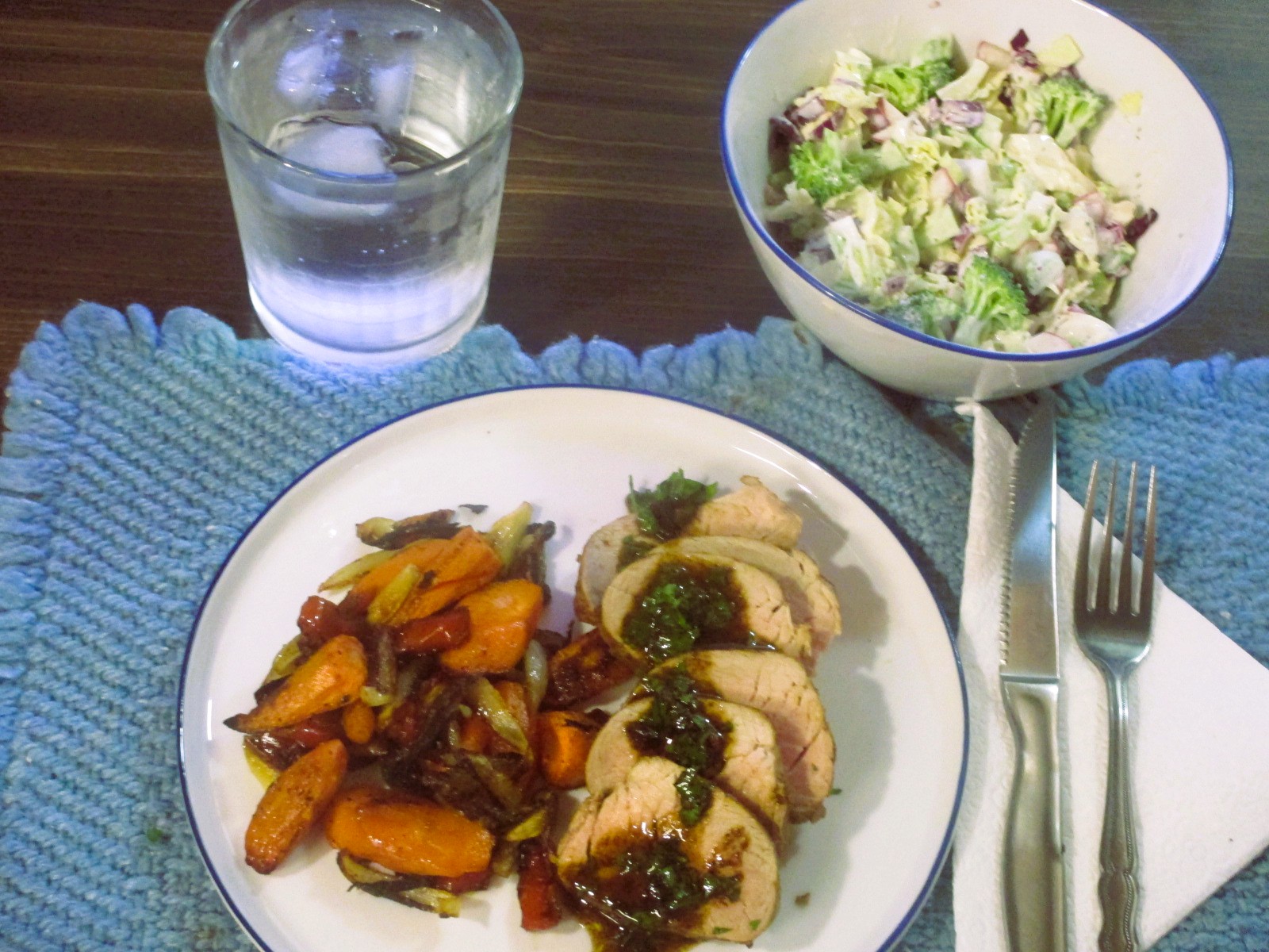 Seared and roasted pork tenderloin with pan drippings and parsley; roasted carrots, onions, peppers and garlic; savoy and red cabbage, broccoli, green onion and radish slaw, creamy dill dressing.