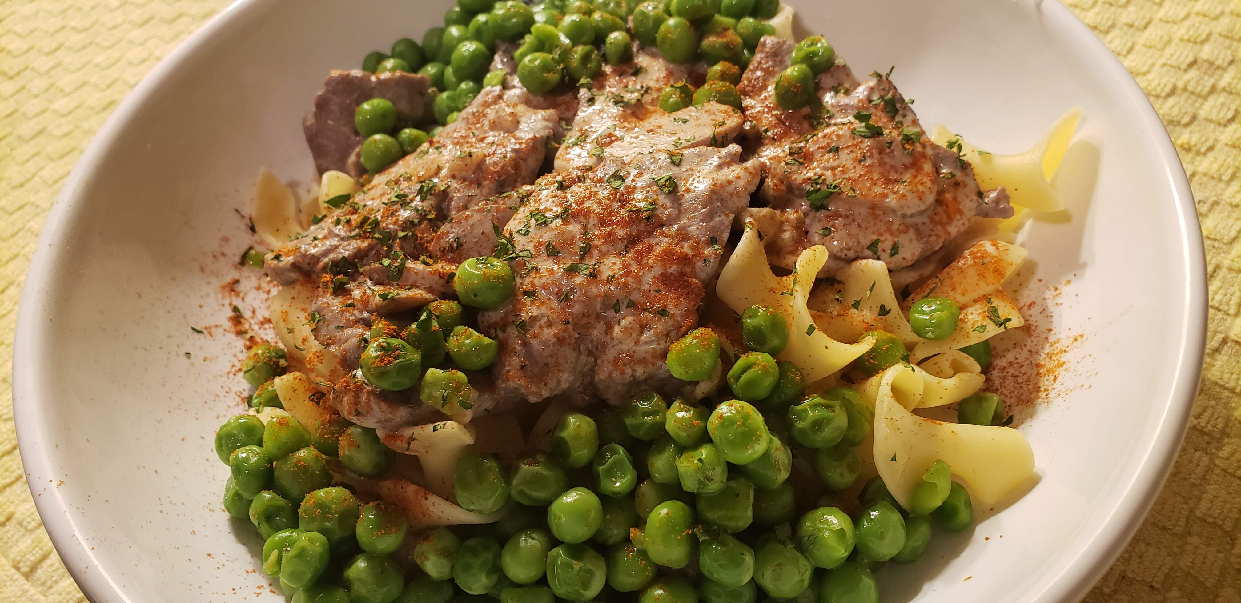 Beef Stroganoff on egg noodles with peas on the side.