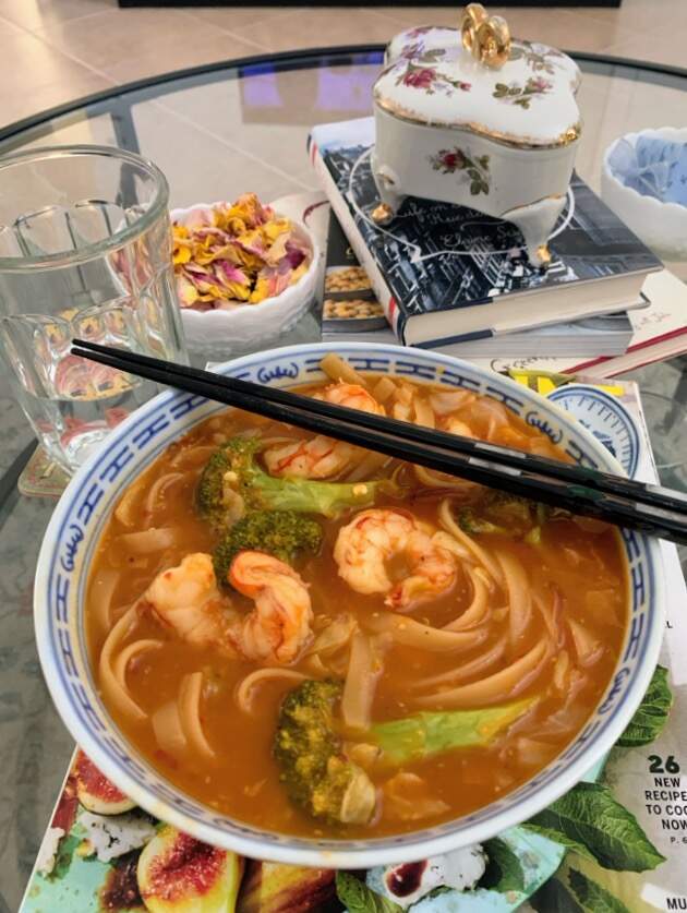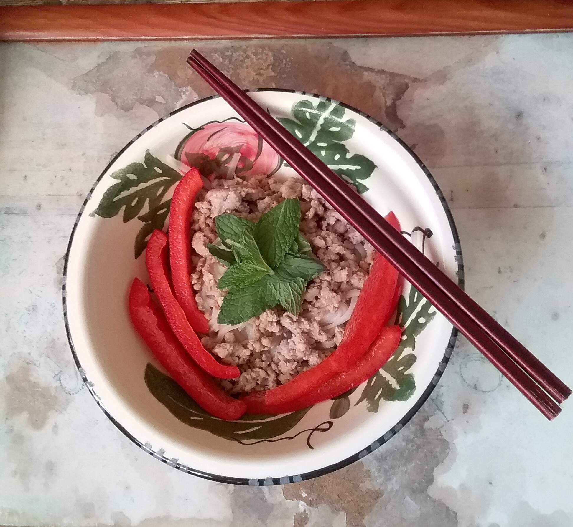 Tonight’s dinner was a pork, red pepper rice noodle bowl garnished with mint. Sriracha added after the photo was taken becase I nearly forgot it ![]()