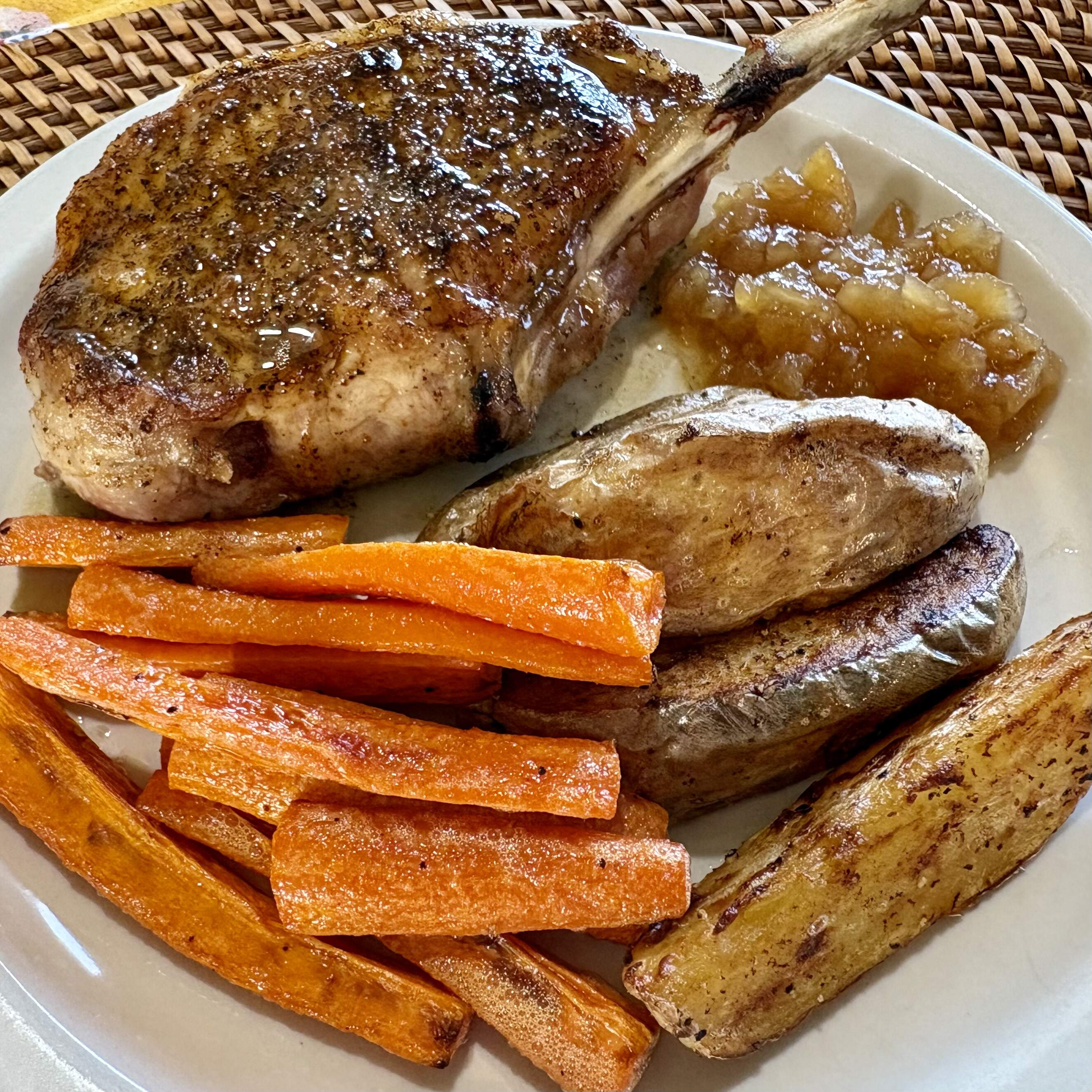 Pan-roasted, bone-in pork chops. Roasted carrots. Roasted potatoes. Homemade Honeycrisp apple sauce.
