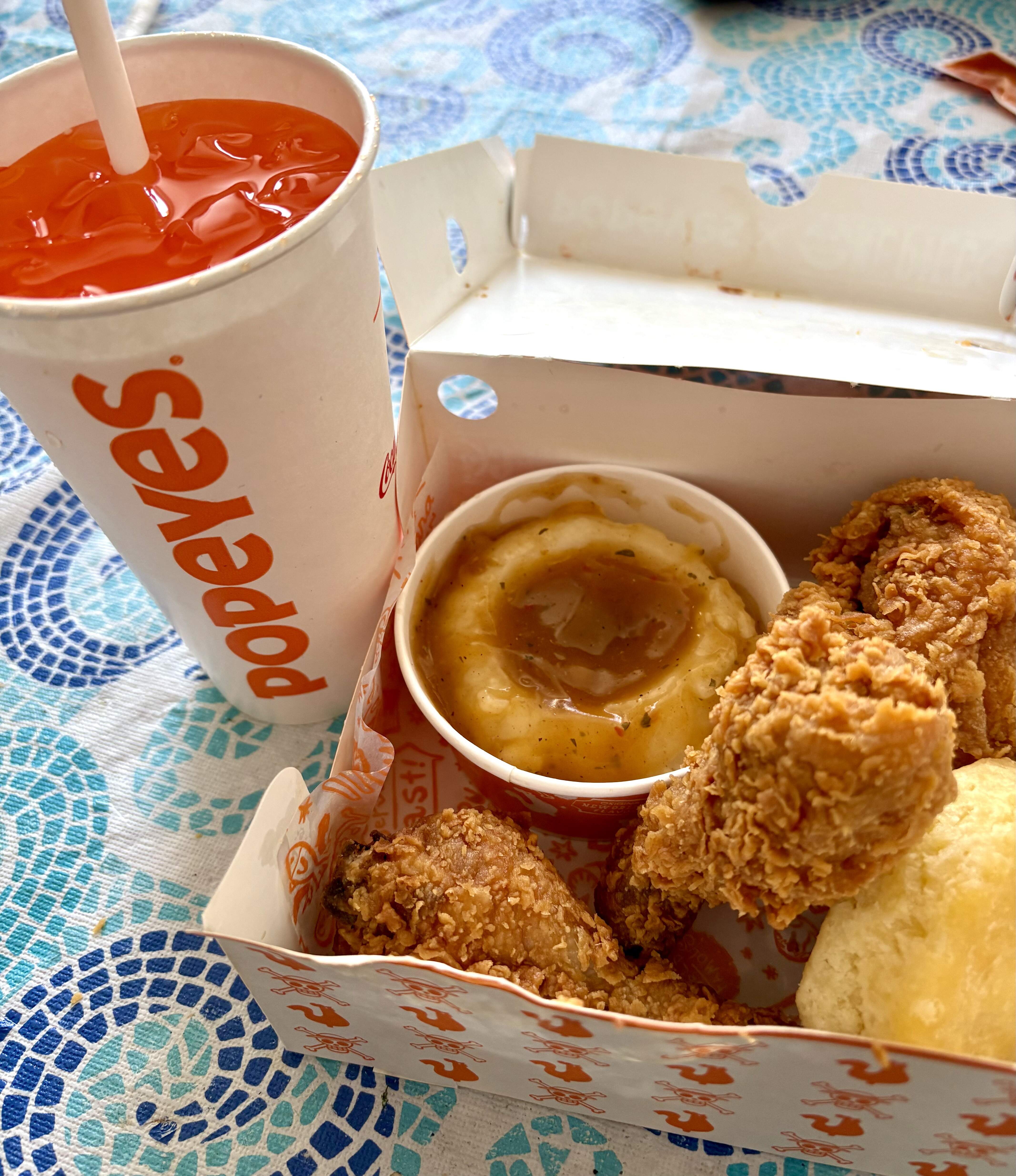 Took a break from cooking and dishes and grabbed some Popeyes, 3 piece with mashed potatoes and an orange soda.