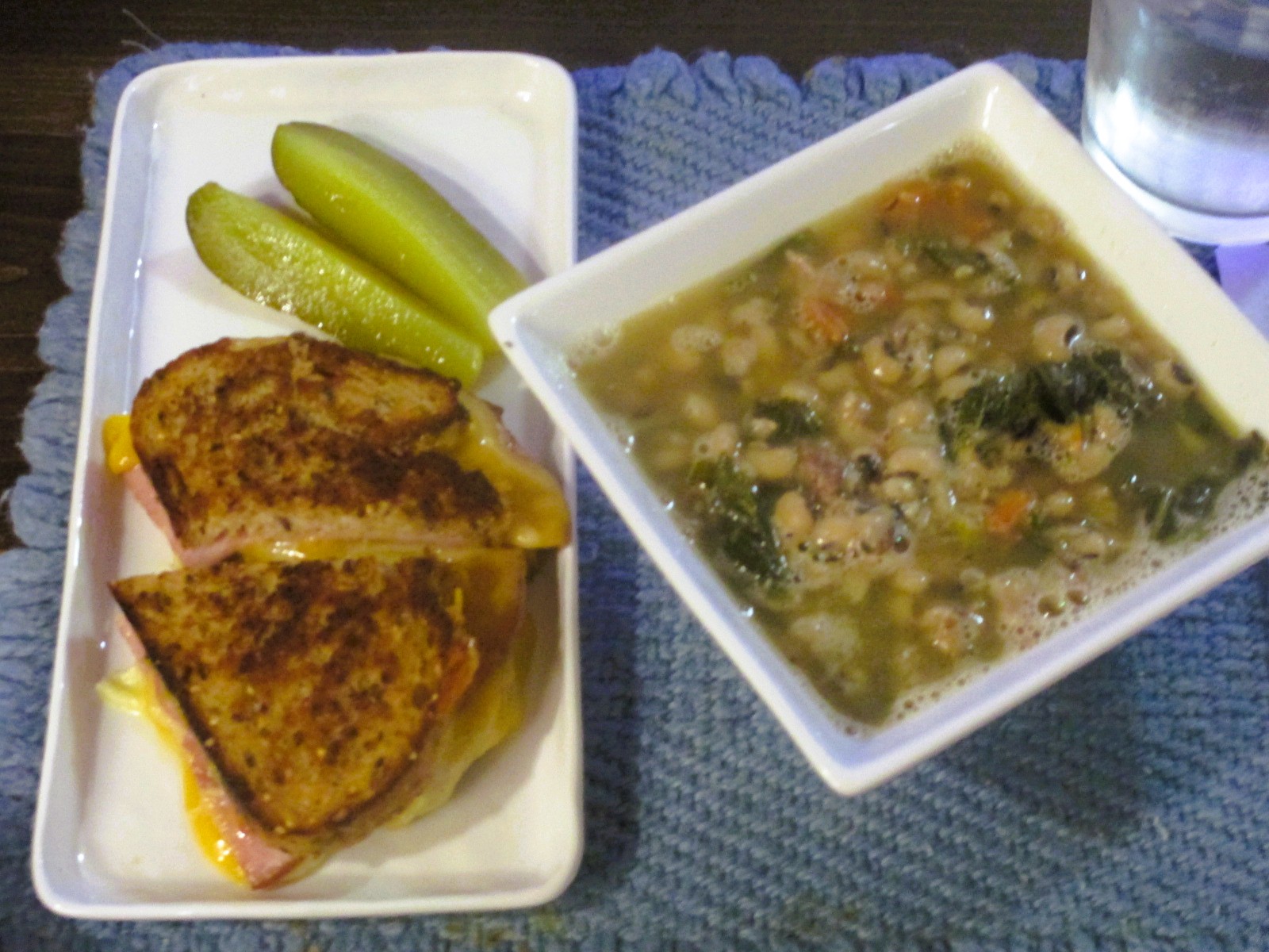 Black eyed pea soup from the freezer; grilled ham, Gruyère and extra sharp cheddar on 8 grain bread; kosher dills.