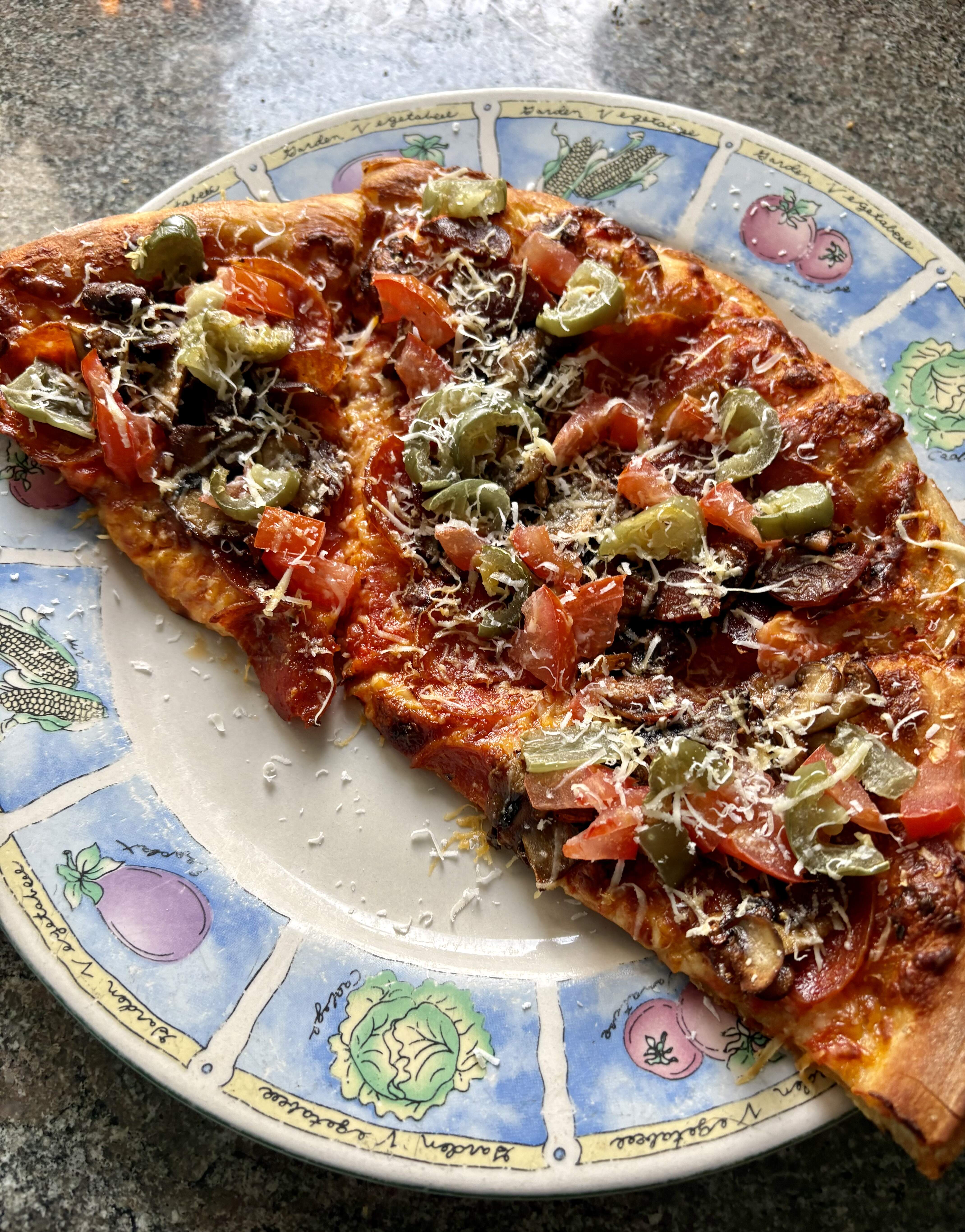 Grabbed a pepperoni pie from my local joint, $10.99 medium, 8 slices, added some sautéed mushrooms, chorizo, diced tomatoes and pickled jalapeños. Showered with Parm/Regg
