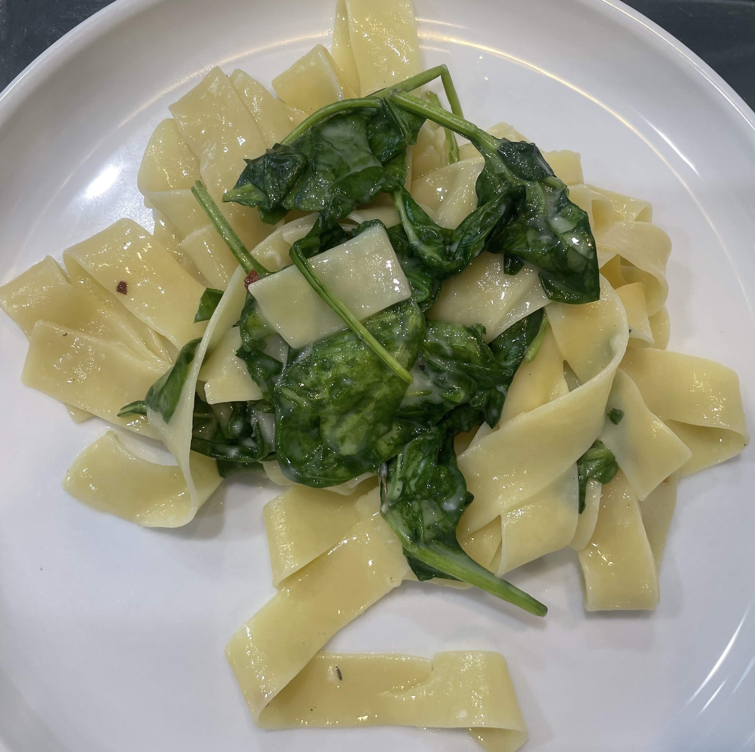 Pasta alla Carbonara with Spinach based on an essen & trinken recipe - cooking traditionalists will of course clutch their pearls but who wants to cook dishes always the same way. Cooking is about trying out new things. Very good vegetarian version of that classic dish with egg, egg yolk, pecorino, parmesan, garlic and olive oil mixed with pappardelle, pasta water and baby spinach. Finished with some thyme and red pepper flakes