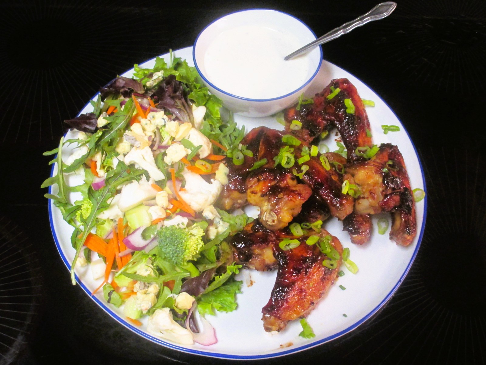 Wings and salad. Wings were roasted and glazed with a mystery Asian sauce from the fridge. Salad was mixed baby greens, arugula, red onion, carrot, broccoli, cauliflower, cambazola, ranch dressing. There was a martini rocks.