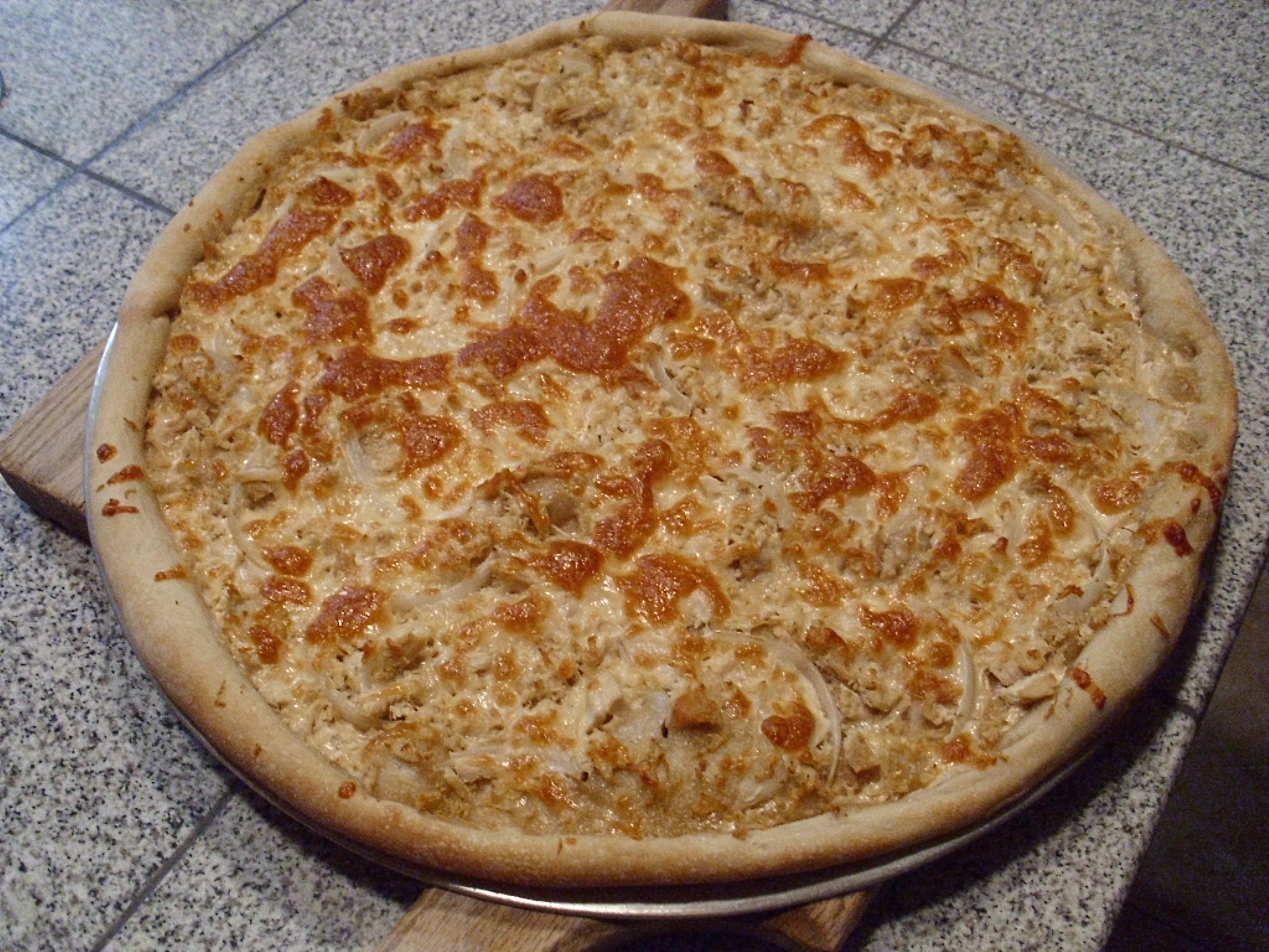 Tonight’s dinner was White Pizza with Shredded Chicken and Onions. Another poster jogged my memory about this pizza, so it was time to make it again.
