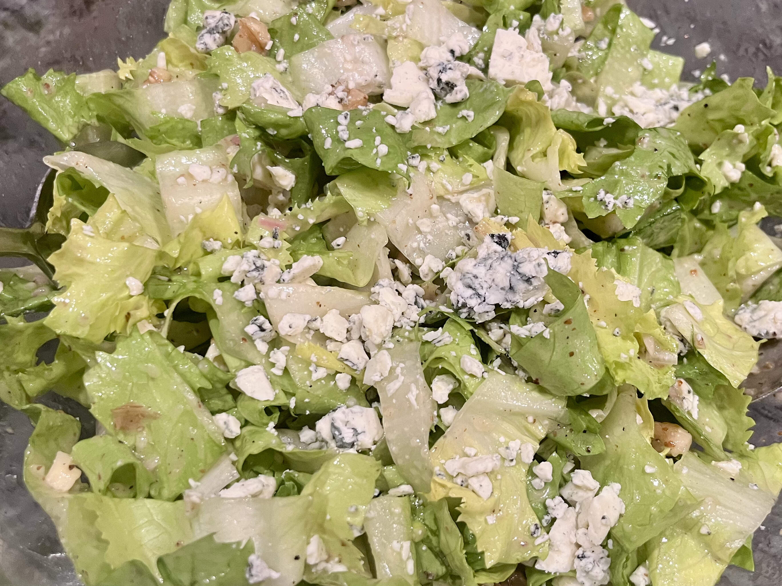 and escarole with blue cheese, walnuts, and a tart & fruity vinaigrette with a fab pear balsamic I picked up in Philly, ½ a finely diced shallot, walnut mustard, and walnut oil.