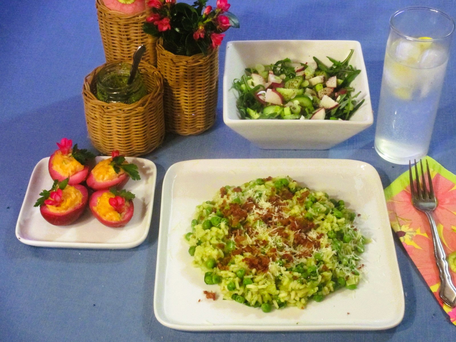My Easter dinner was risi e bisi, I used arborio rice and added a sprinkle of bacon bits; arugula, green onion, cucumber and radish salad with pesto dressing; deviled pickled eggs and lemon tonic.