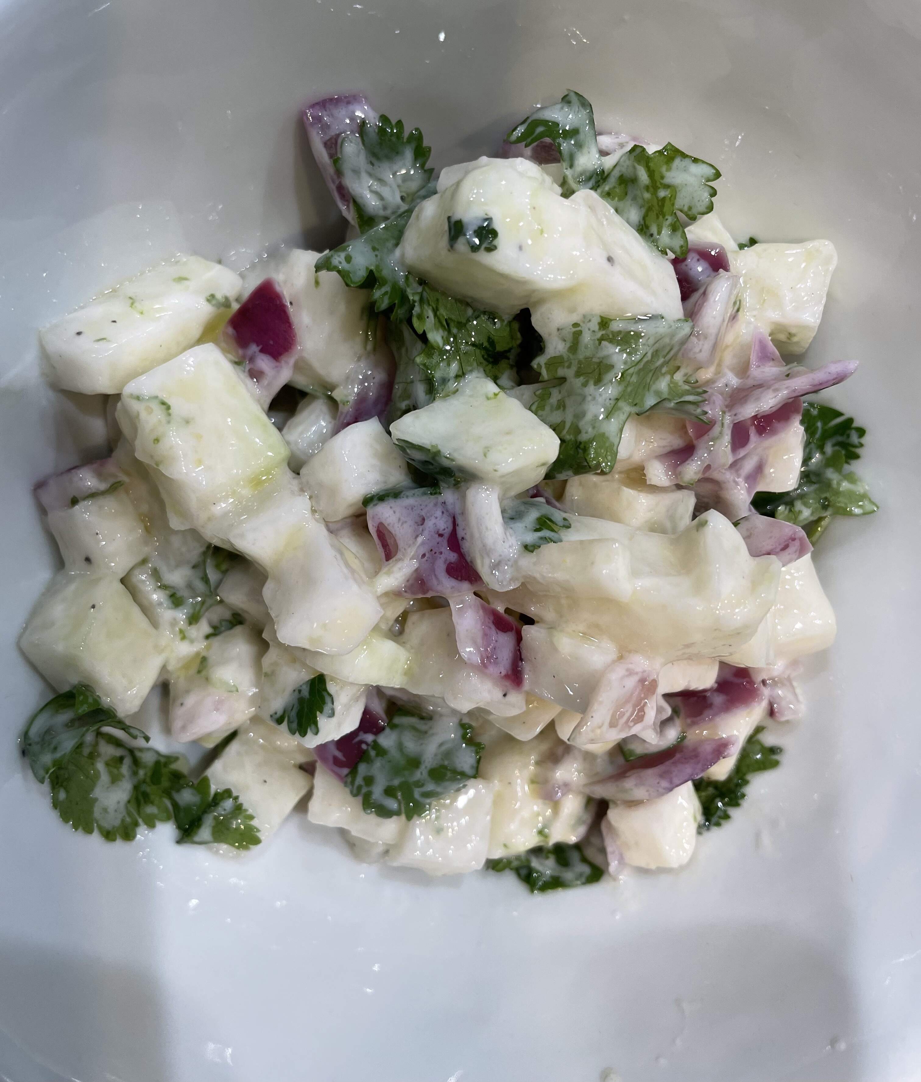 Indian-Inspired Cottage Pie - sugo is cooked with ground beef, onions, garlic, ginger, cardamom, coriander, chili, cumin, garam masala, diced tomatoes, tomato paste and beef broth. Mashed potatoes are made with russet potatoes, egg yolks, butter and milk. Baked in the oven for 30 minutes. Served with a salad made with kohlrabi, red onions and cilantro and a vinaigrette with olive oil, yogurt, lime juice and zest