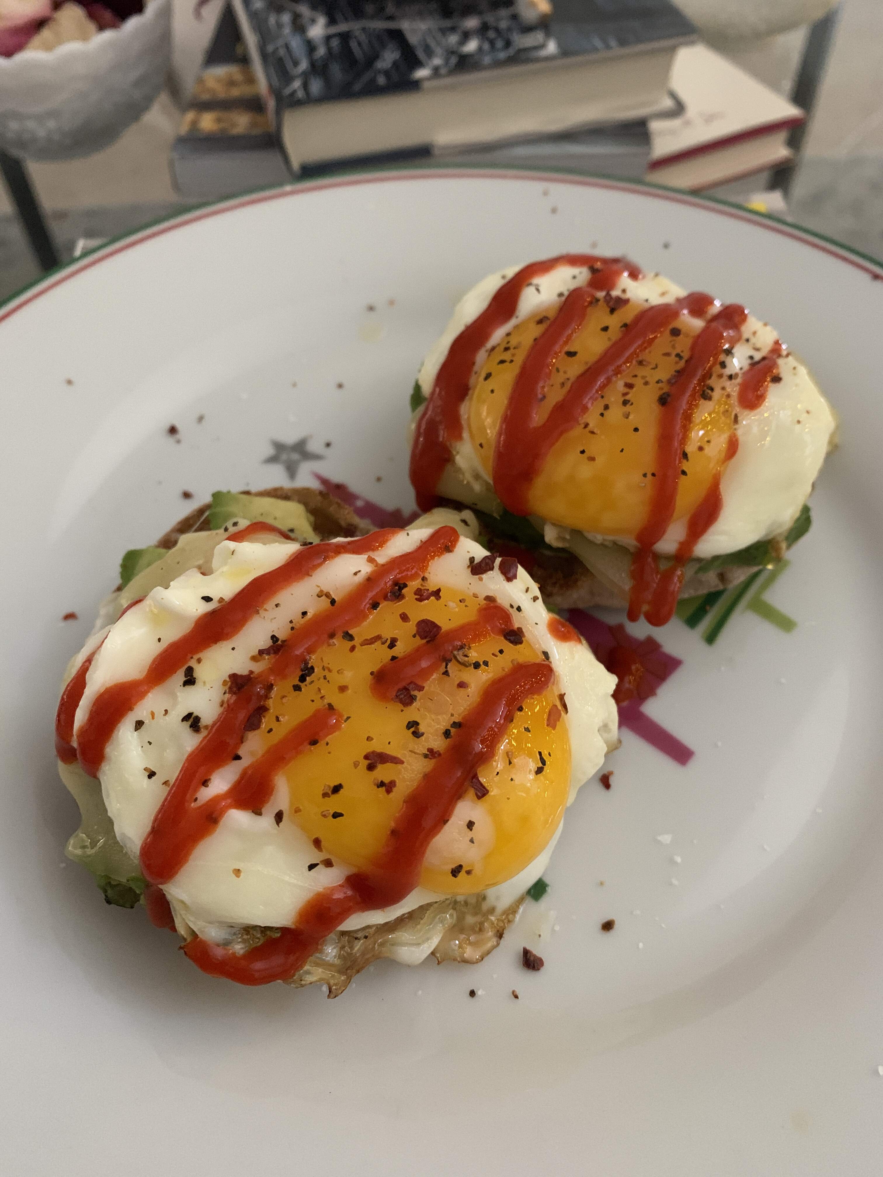 English muffins, mayo, avocado, swiss cheese, eggs cooked in butter, sriracha. S&P.