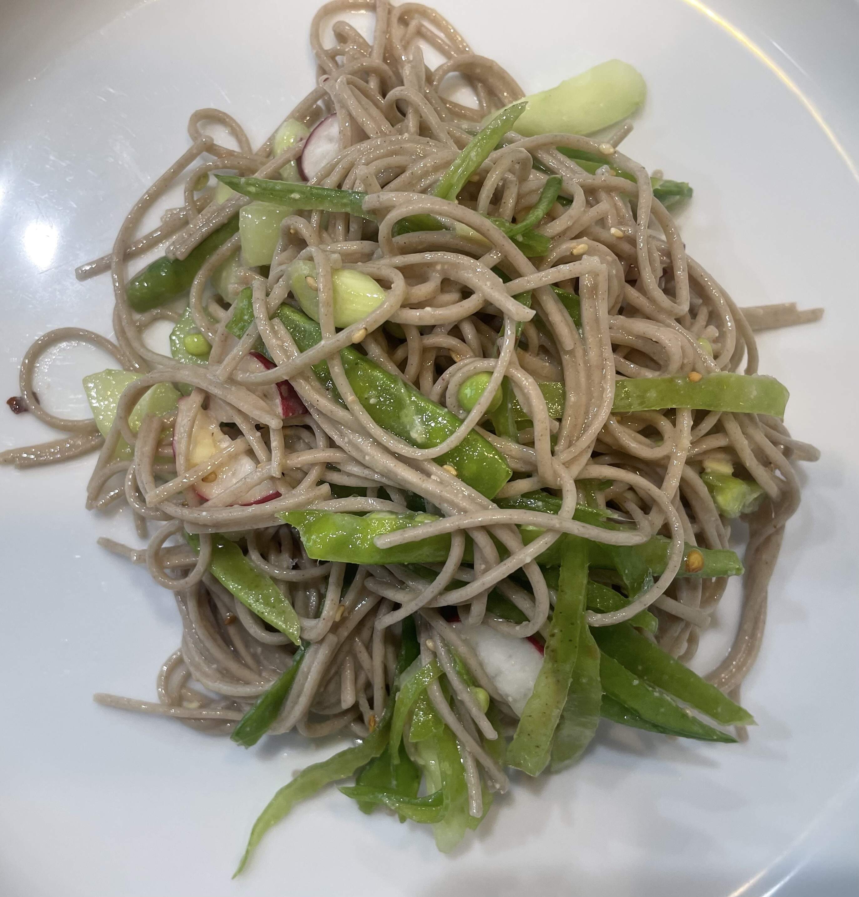 Chilled Soba Noodles with Cucumber, Snow Peas, and Radishes from a CI recipe - mix of soba noodles, snow peas, cucumbers, scallions and radishes and a vinaigrette with white miso, mirin, toasted sesame oil, ginger, toasted sesame seeds and red pepper flakes