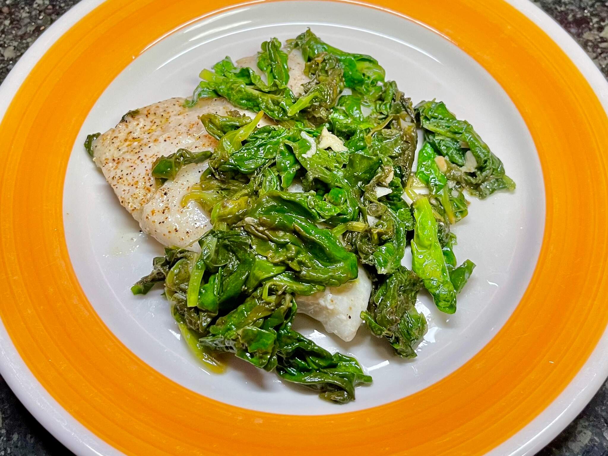 A simple, gentle meal for an edgy night. Hake with stir-fried pea shoots and spinach, somewhere between sauteed and steamed.