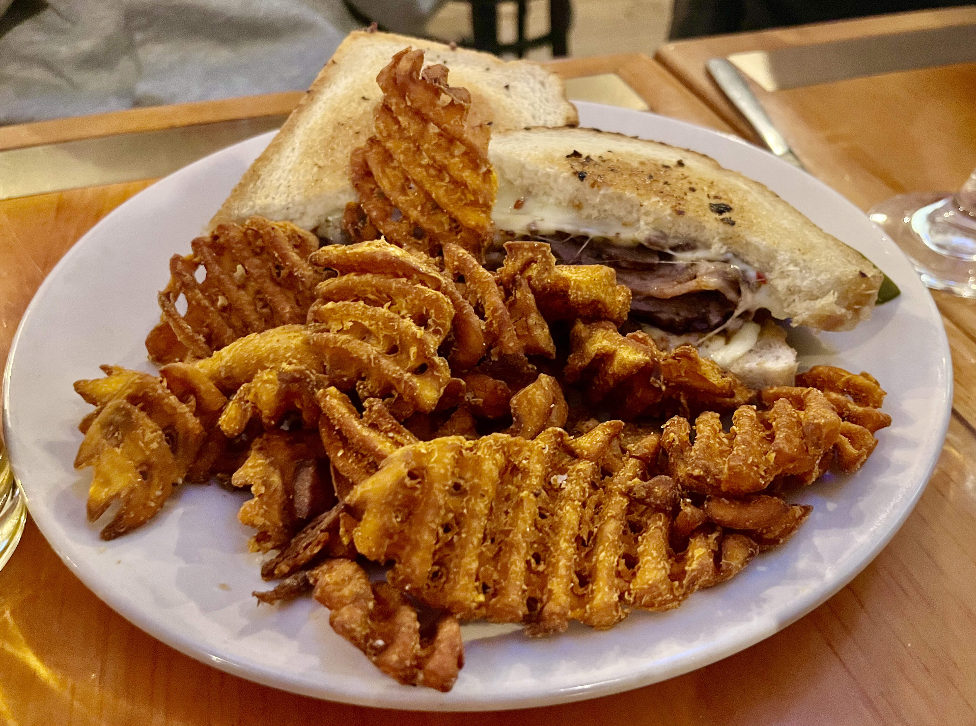 our pesca the haddock sammich — no pic cuz it looked a bit anemic TBH, and his boo the brisket grilled cheese (on my recommendation), half of which she took home.