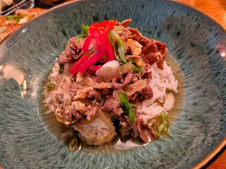 leftover gyudon, but the BF also made us Korean pancakes and pulled some of my pork dumplings out of the freezer and pan-fried/steamed them. The pancakes were nice and chewy.