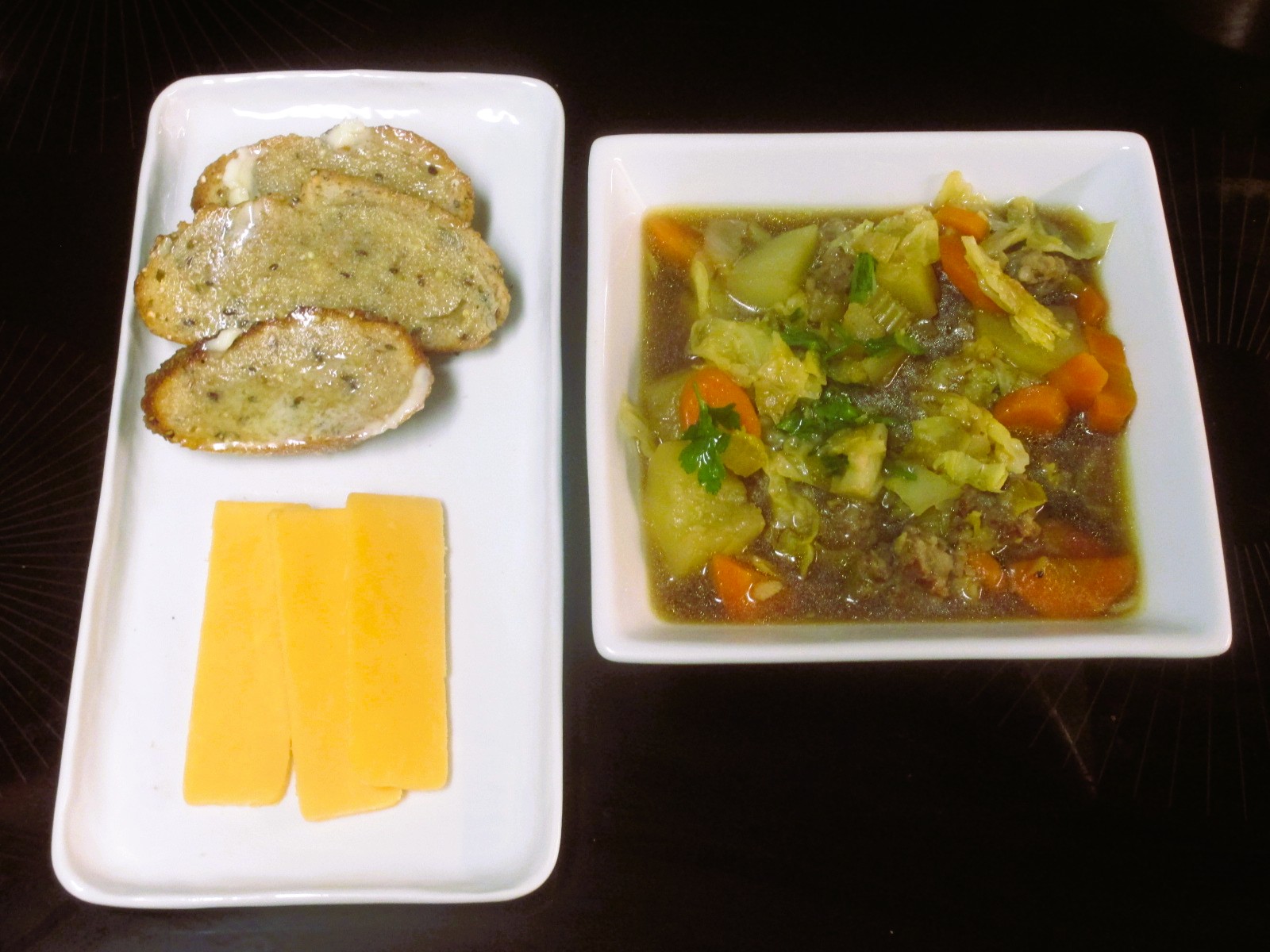 Soup for a chilly cloudy day. Irish O’ Garlic sausage, garlic, leek, carrot, celery, cabbage, potato, beef broth, bay leaf, parsley; warm buttered 8 grain bread and extra sharp cheddar.