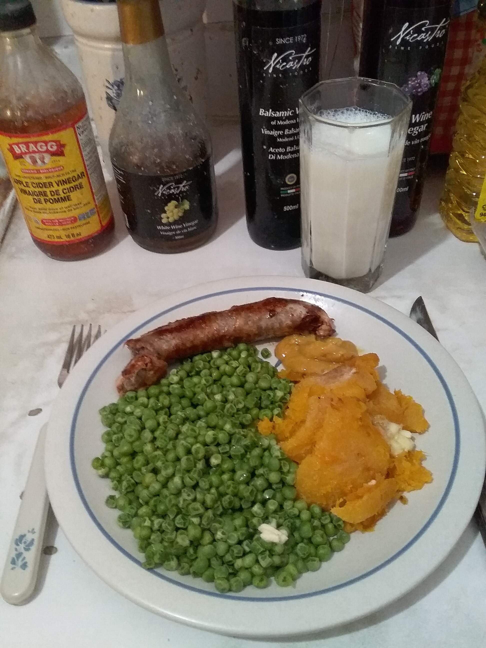 Dinner tonight was a farmers sausage from the farmers market, acorn squash from last year’s CSA and a Proverbial