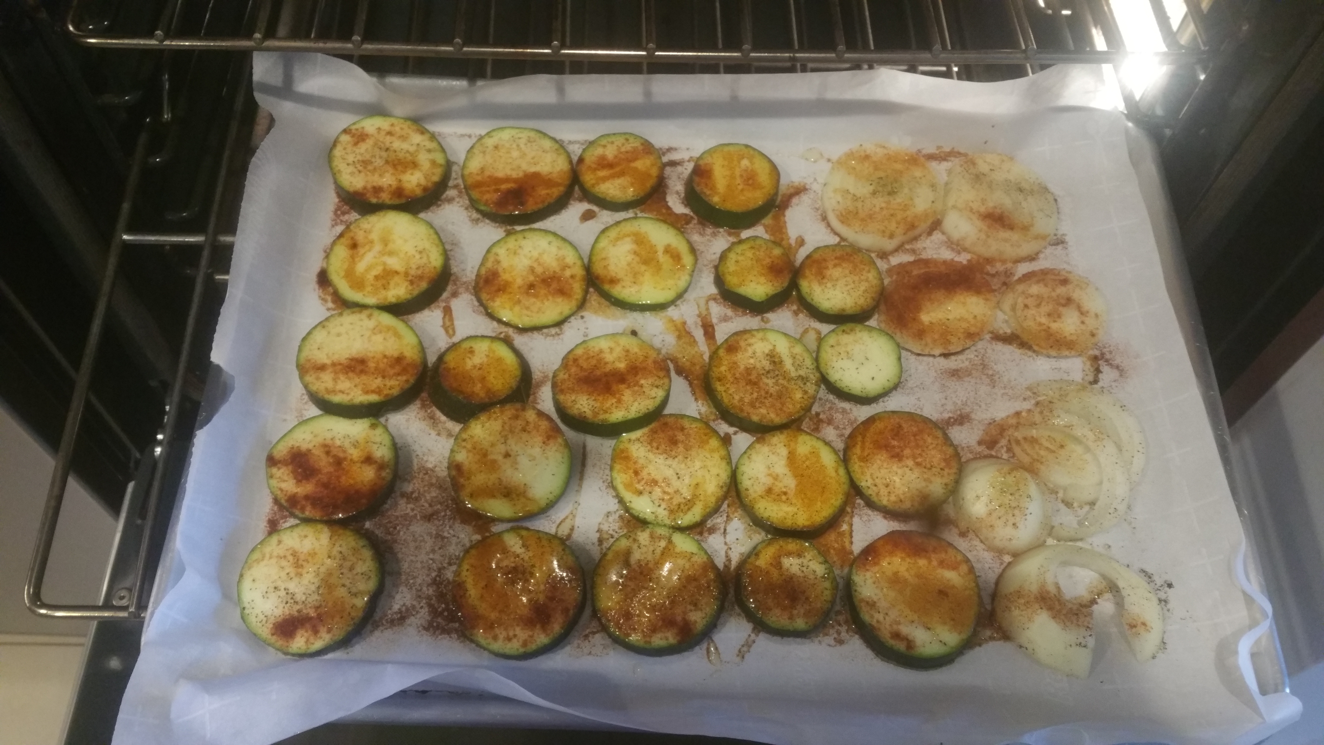 Up early this morning, cleaning up a bit. Found some zucchini in the fridge, going in for a simple roast with some curry powder S&P and EVOO…