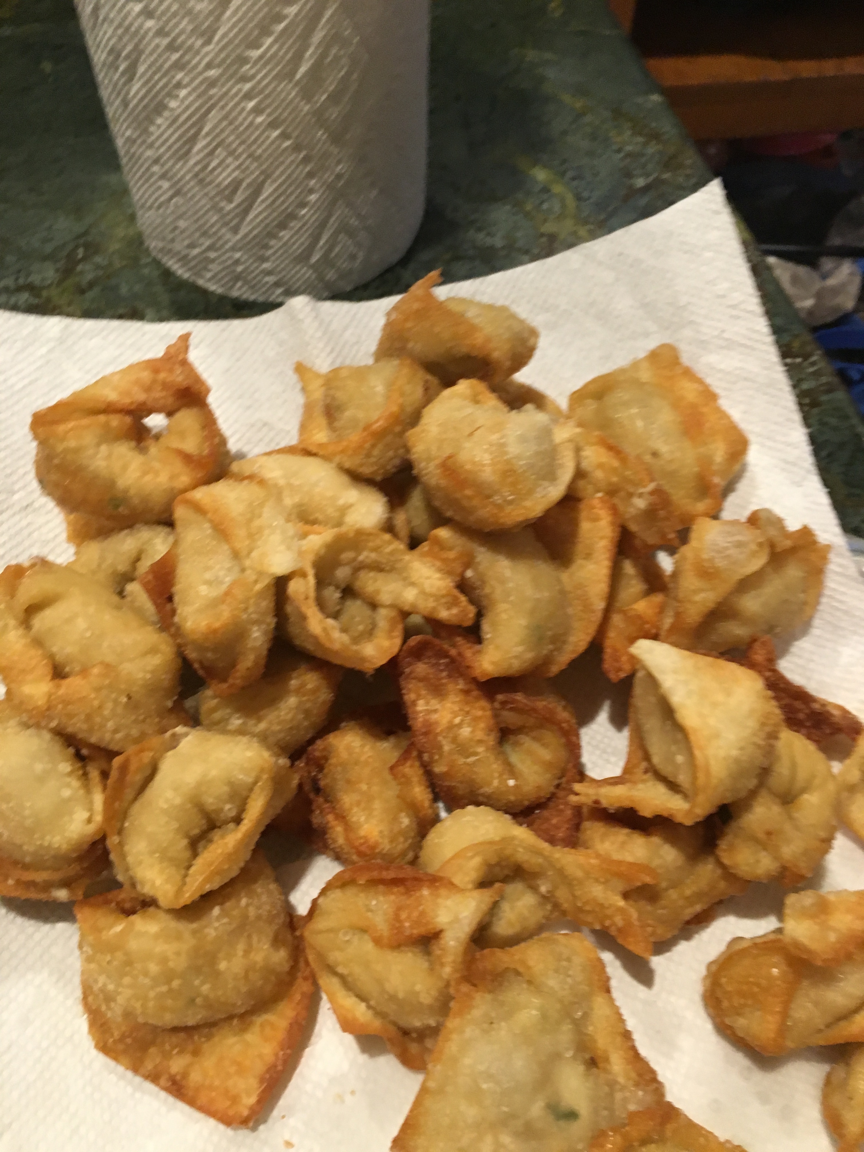 Three of us made a double batch of these crab rangoon - they’ll be fried at half-time: http://www.vietworldkitchen.com/blog/2016/01/original-crab-rangoon-recipe.html