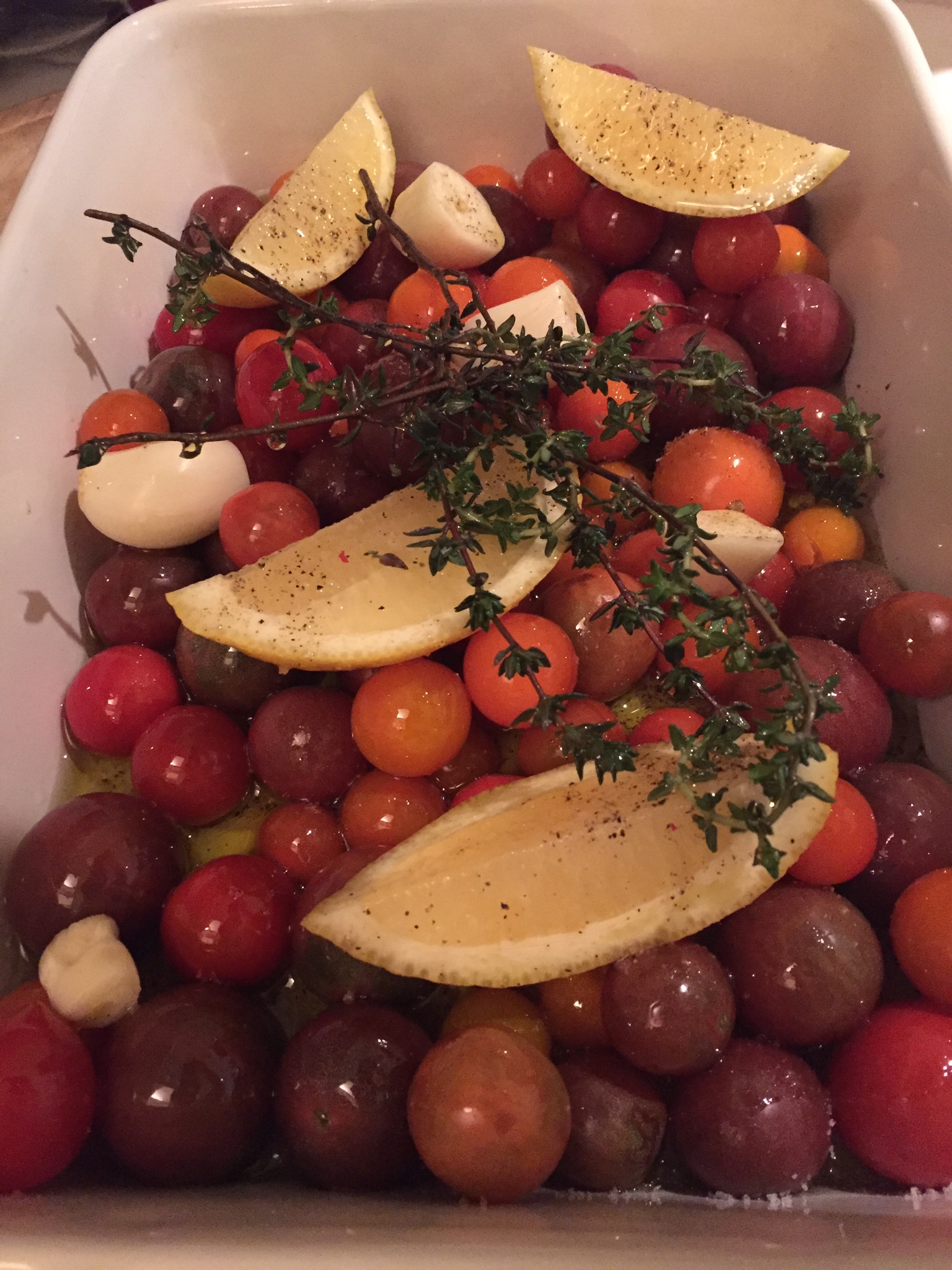 Also needed to use the last of the FM cherry tomatoes from last weekend so I roasted them up with some garlic, lemon, and thyme.