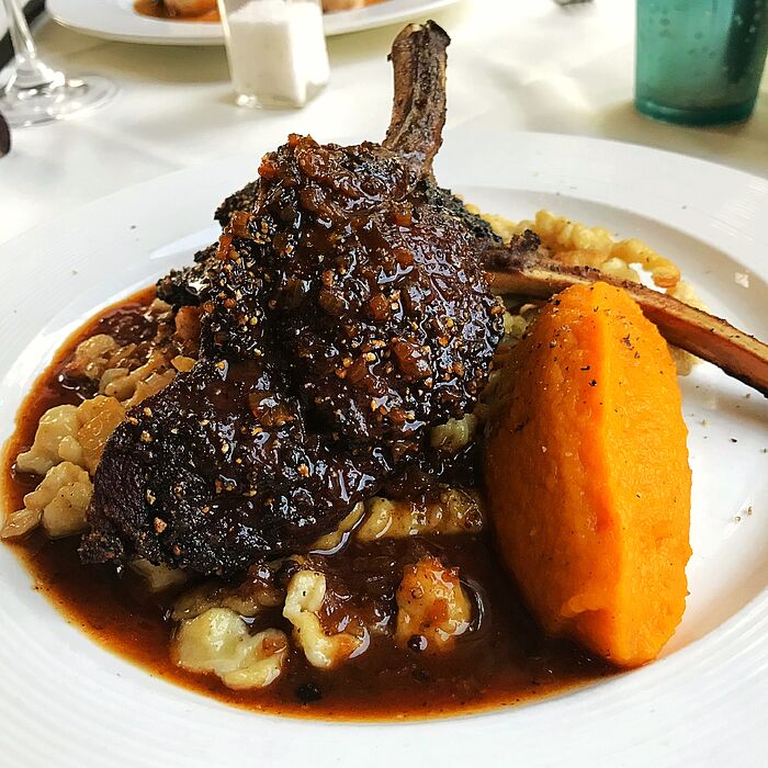 Tonight was the fabulous Mrs. P’s birthday and we had an awesome dinner at Cafe Panache in Ramsey, NJ. We started off with seared shrimp in paprika lemon butter sauce with heirloom tomatoes and fried sage. We also shared handmade pumpkin agnolotti with butter and parmesan. For entrees I had outstanding imported venison chops in aromatic madeira wine sauce with buttered spaetzle and sweet potato puree. Mrs. P had excellent diver scallops with cauliflower flan, pickled chanterelles, in a lobster sauce. For dessert we had melt in your mouth coconut cake and caramel gelato (not pictured). It all went great with 2011 Domaine Lafond Chateauneuf Du Pape