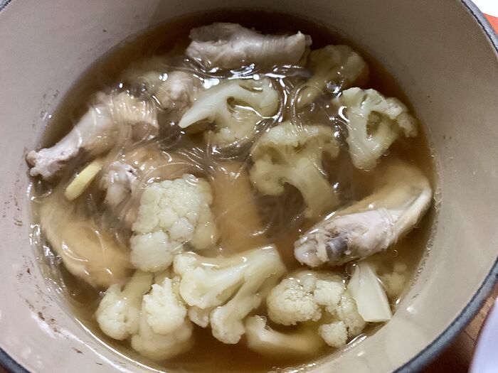 He seemed to have fallen ill and most likely caused by lack of proper sleep due to work for past few months. Made this simple soup tonight - ginger slices, cauliflower, chicken wings and glass noodles. Served with white rice, salted edamame and salted saba.