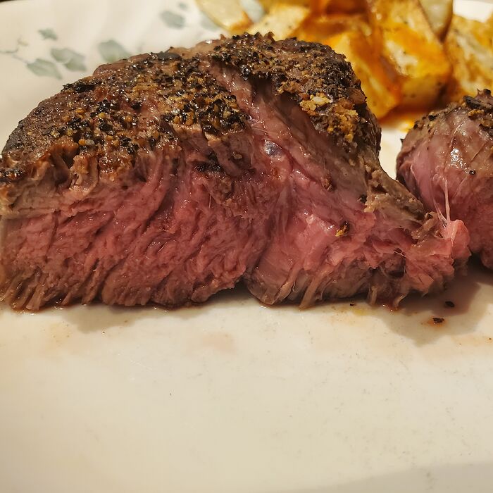 Salt and pepper crust. Three minutes on each side in cast iron. Finished four minutes in the oven. Perfectly rare. Side of air fryer potatoes.