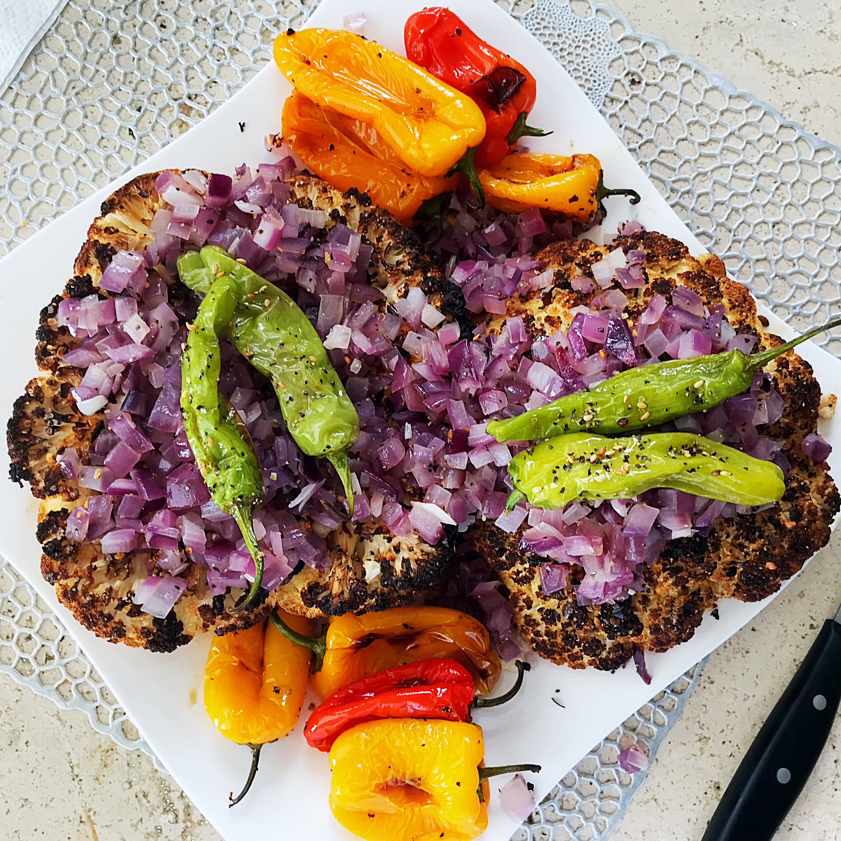 Mrs. P made a healthy roasted cauliflower steak topped with sautéed red onions, and roasted shishito and mini peppers on the side. I topped it off with spicy Korean Gochjang sauce to give it a nice kick. It was also marinated in balsamic vinegar to give it a nice char.