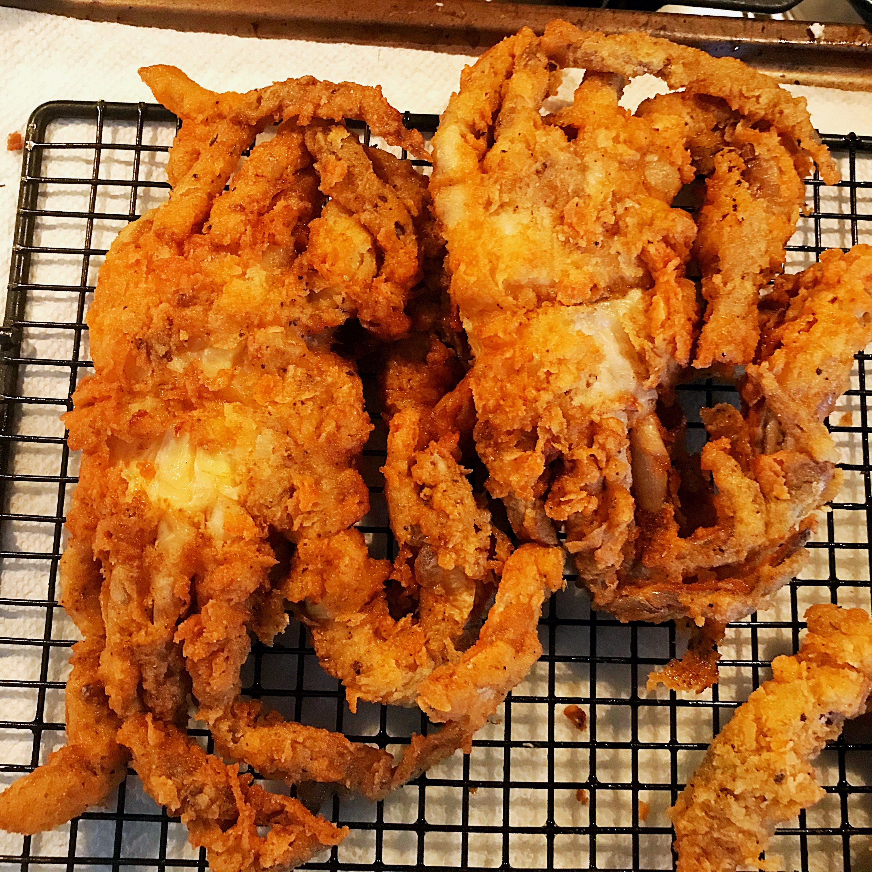 I purchased some beautiful fresh soft shell crab from Kings Food market. Mrs. P made crispy deep fried soft shell crab using self rising flour which really gave it a nice crunch. She also made fried shrimp and fried avocado (for the first time). She also made a refreshing Jersey corn salad. We enjoyed an excellent French red wine. Mrs. P made a delicious caper, butter, fresh home grown herbs, and vermouth sauce to go with it.