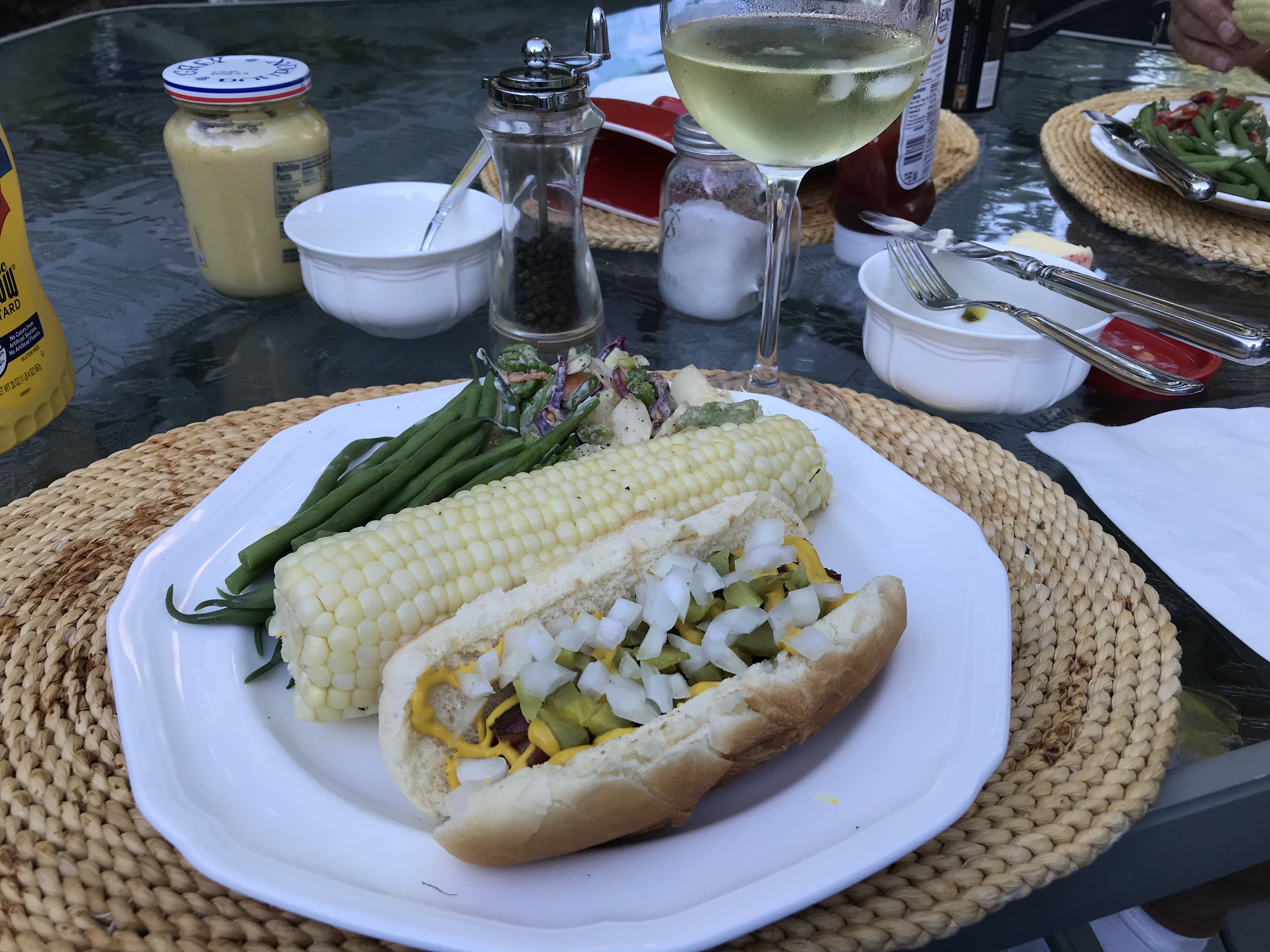Saturday nights dinner - by request for my birthday! Didn’t want to go out, and was craving hot dogs, happens about X 2 yearly. Ball Park beef franks was what they had at country store. They were perfect w/Walla Walla sweets, dill pickles, finely chopped, and French’s yellow mustard. Wine. Brownies with ice cream for dessert. A perfect day!