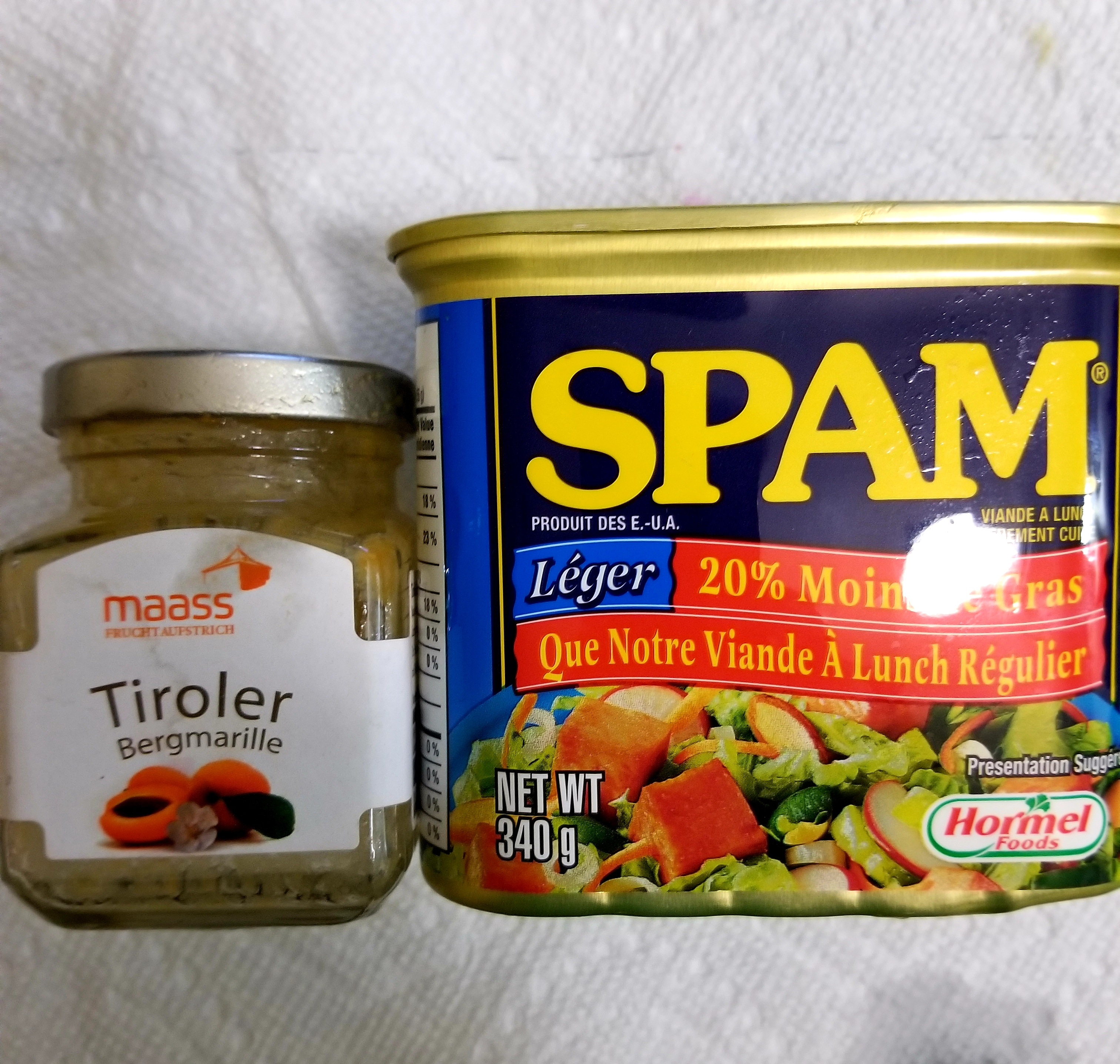 Spam and some mountain apricot jam I brought home from Ischgl in March 2019. Ischgl is the village which unfortunately was the epicenter for the Austrian outbreak, and thousands of cases in Northern Europe can be traced back to tourists who visited Ischgl. I was there exactly a year before it was shut down this year.