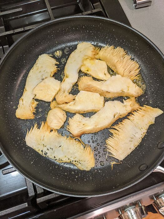Lest you think we’re reckless - I couldn’t get a definitive ID on this one (debated between funnel chanterelle and false chanterelle), and chucked it. The vascular structures/gills and interior color weren’t quite right. Also suspect as it was growing on a log near another.