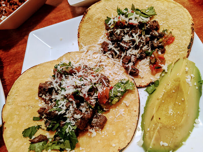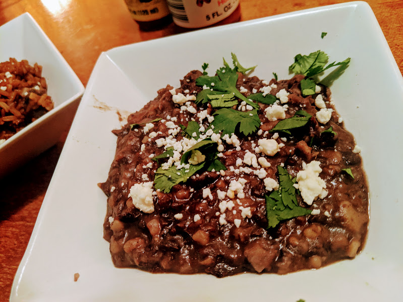 rather a brown dinner… Zhoug marinated steak became tacos, and I made refried beans for the first time (which really doesn’t mean fried twice, but fried extra, in case anyone was wondering.) I used RG’s ayocote morados, fried in bacon fat, and mushed until creamy but still with some consistency. added a tiny pinch o’cumin and a small shot of habanero hot sauce. mexi-rice turned out extra dark because i cooked it with the bean water and then accidentally added just a bit more chipotle powder than I’d intended. the queso on everything was a grateable white similar to cotija but with loroco. I thought this would all be too many strong flavors but nah, worked out just fine.