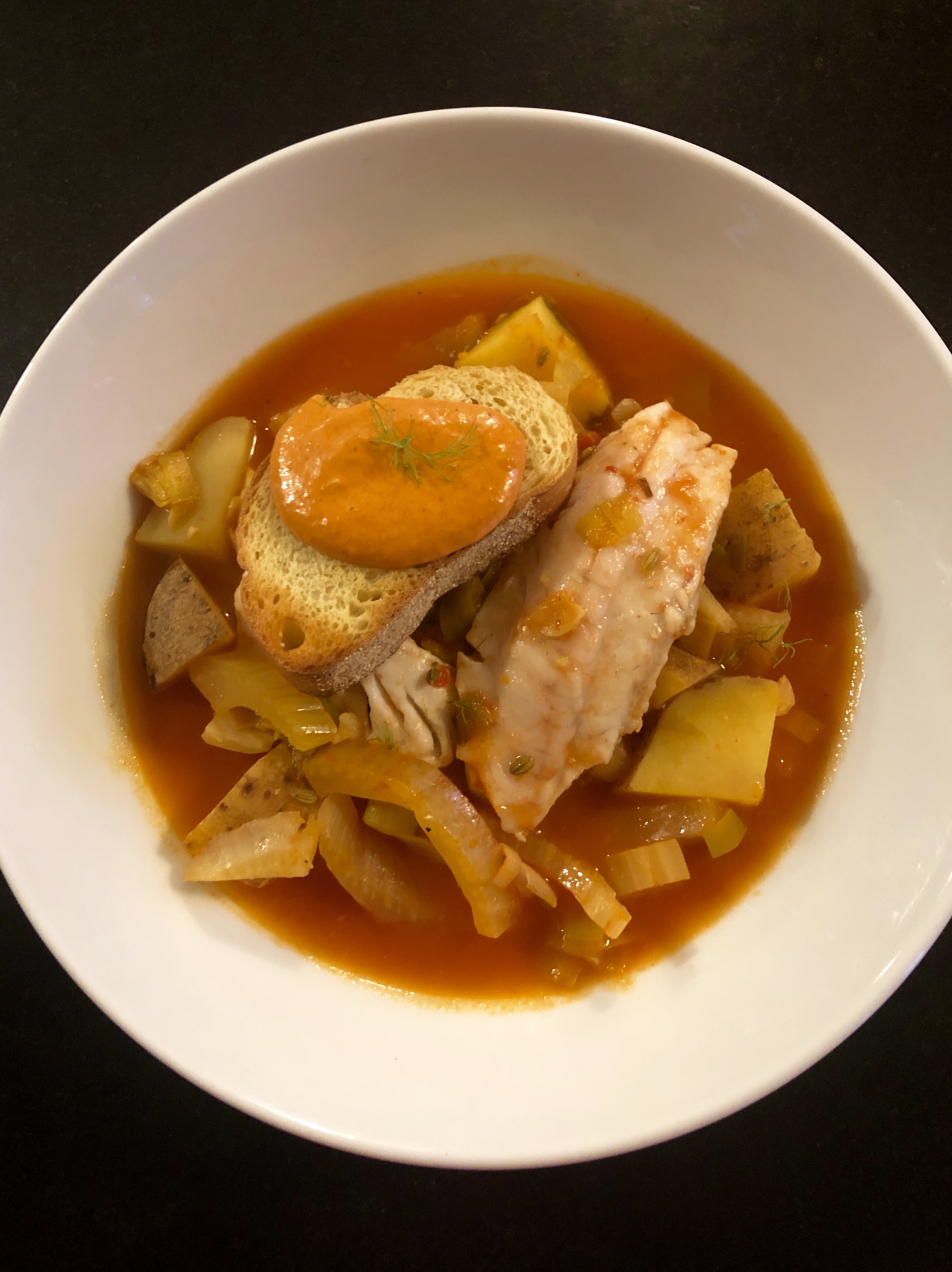 We had a small amount of fish leftover after Mr Bean packaged up the latest black sea bass catch. Since it was a cold and rainy day, and I had some fennel I needed to use up, bouillabaisse seemed like the perfect dinner. I usually make a rouille hack (mayo and smoked paprika) but I happened to roast a bunch of Hatch Chiles the other day so I decided to make a real one. WOW! It was way easier than I thought and so good. I’m a convert.