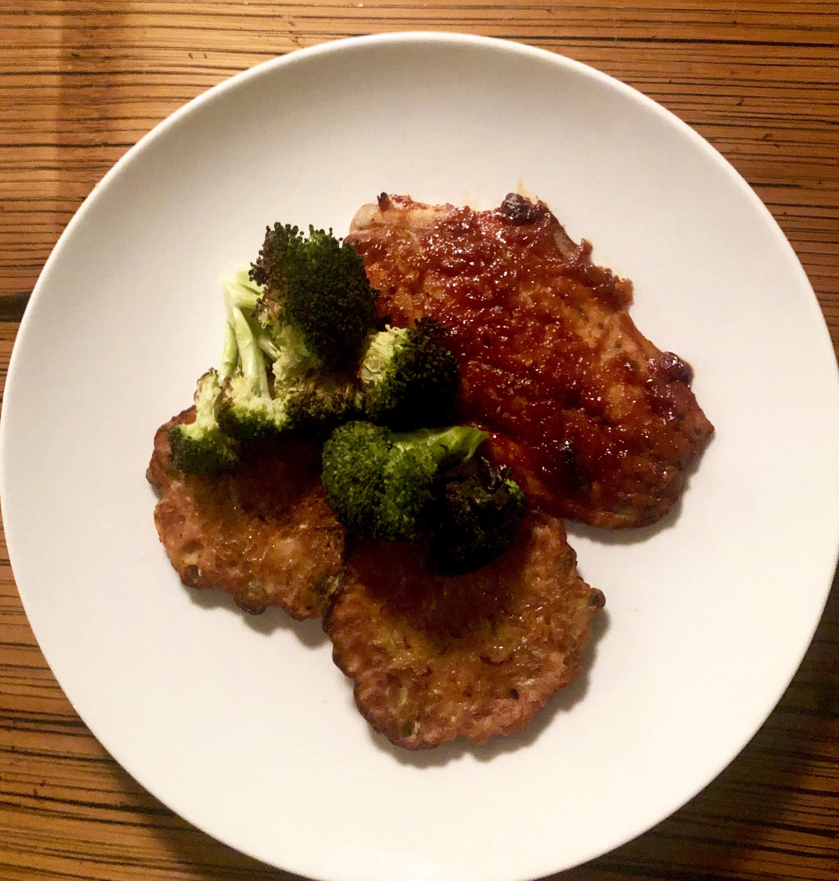 The New York Times recipe for Korean sauerkraut pancakes inspired dinner. I didn’t have sauerkraut but I did have some kimchee to use up which worked perfectly. I took some blue fish out of the freezer as I needed something to stand up to the strong flavors in the pancakes. I made a quick sauce of pickled ginger, gochujang, and sesame oil and broiled this fish until just done (I hate “well-done” fish). Served with the pancakes and roasted broccoli.
