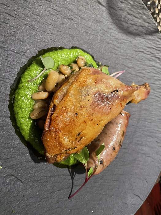 We enjoyed huge wood fired Gulf prawns with chili relleno; crispy Korean chili tempura black bass with pickled vegetable spring rolls; refreshing buratta and strawberry salad; beautifully charred octopus; the always excellent duck confit and local sausage with an incredible watercress and green garlic puree; Snake River Farms American wagyu hanger steak with a delicious crispy local asparagus and gruyere spring roll and crispy maitake mushrooms. It all went great with an excellent Chateauneuf Du Pape.
